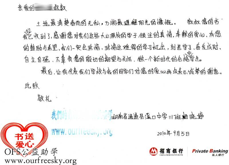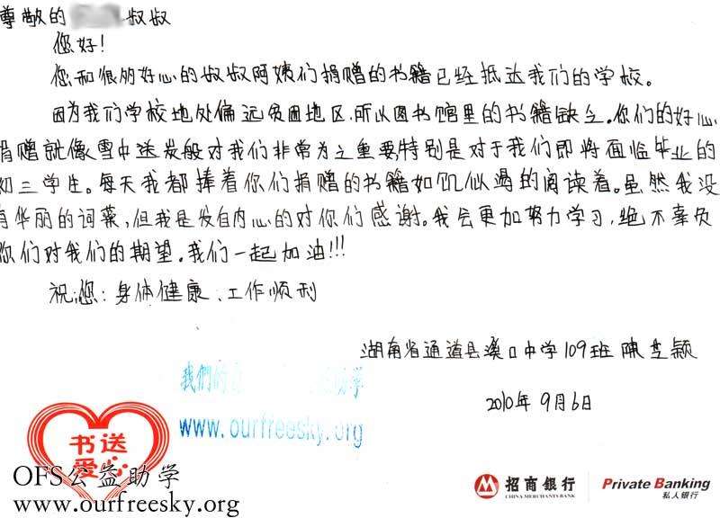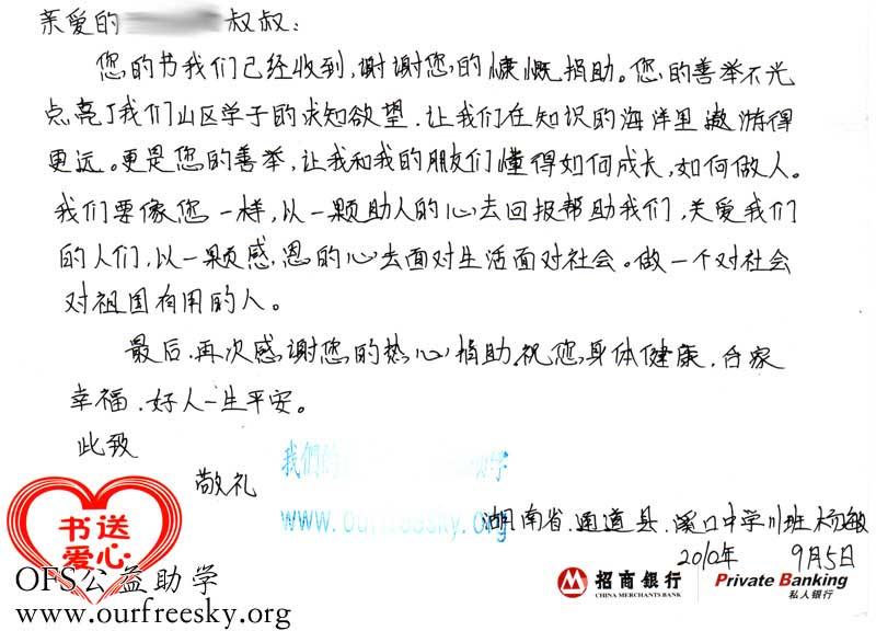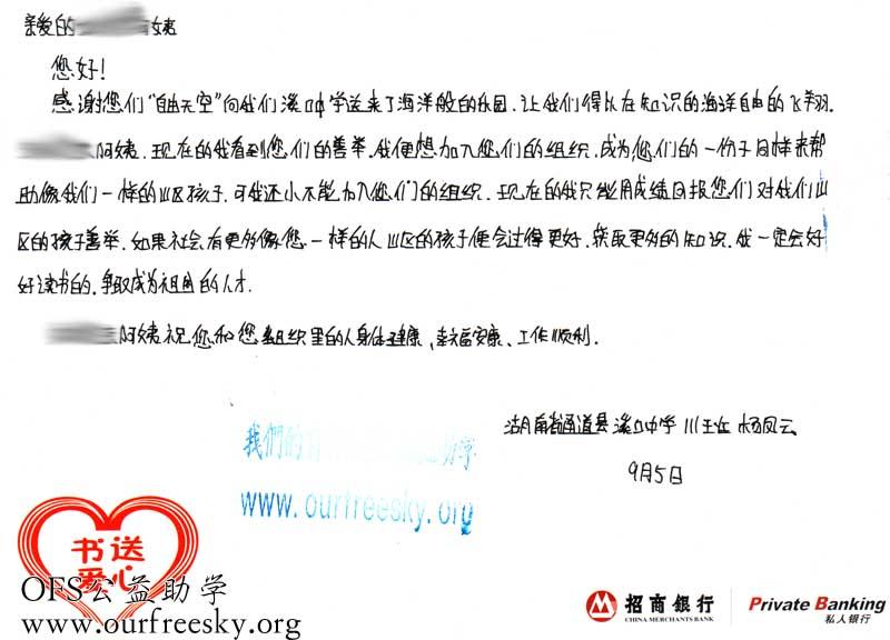 来自湖南怀化市通道侗族自治县溪口镇中学的感谢卡: