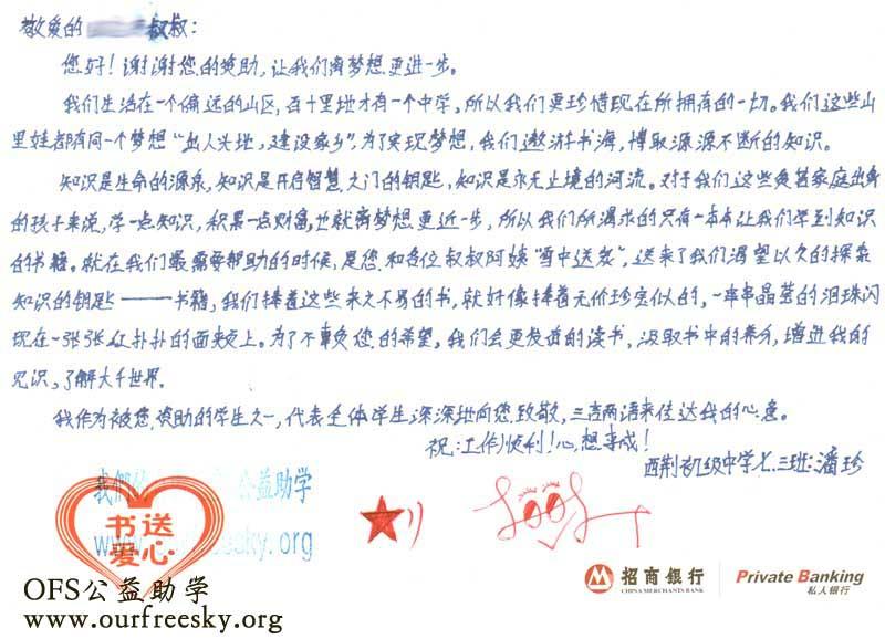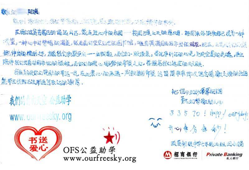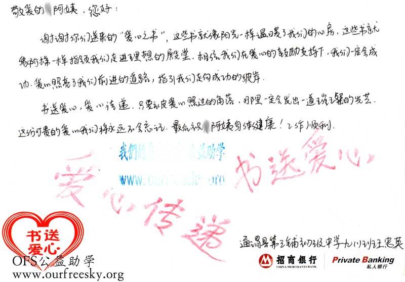 来自陕西省商洛市商州区西荆初级中学的感谢卡: