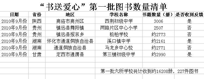 招商银行私人银行联手万事达、壹基金、OFS合作启动“书送爱心”活动第一期已经完成,相应图书发送到位,以下是第一批学校接收到的图书数量清单: