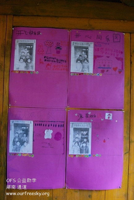 墙报上是孩子们自己设计的小组名称和口号,并附了小组成员的照片。看得出,老师真是费心了!