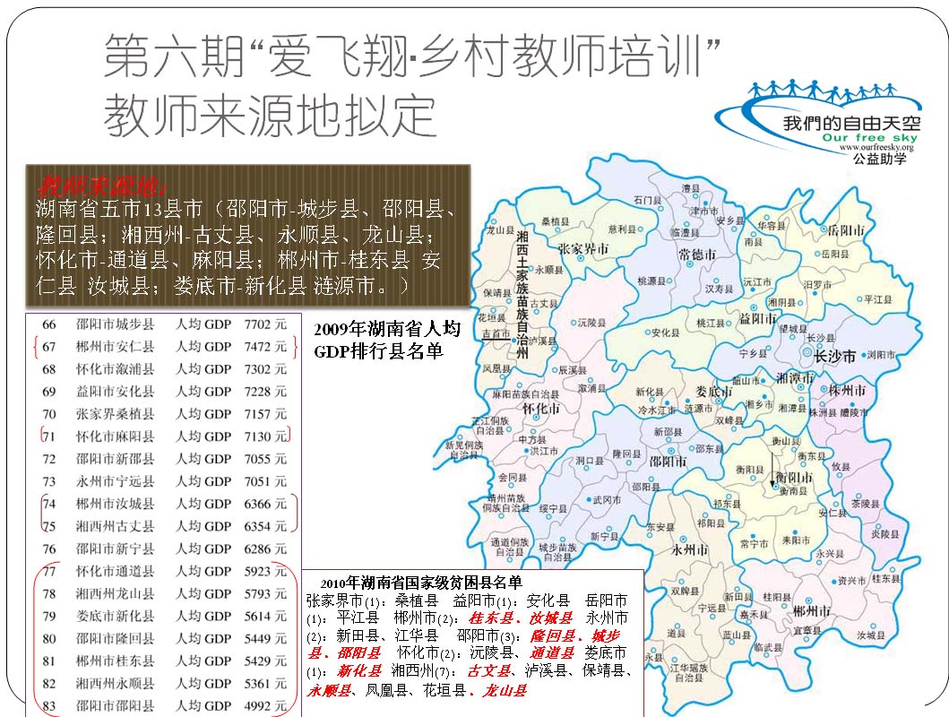 第六期爱飞翔·乡村教师培训教师来源地拟定:湖南省13县市(邵阳市-城步县、邵阳县、隆回县;湘西州-古丈县、永顺县、龙山县;怀化市-通道县、麻阳县;郴州市-桂东县  安仁县  汝城县;娄底市-新化县 涟源市)