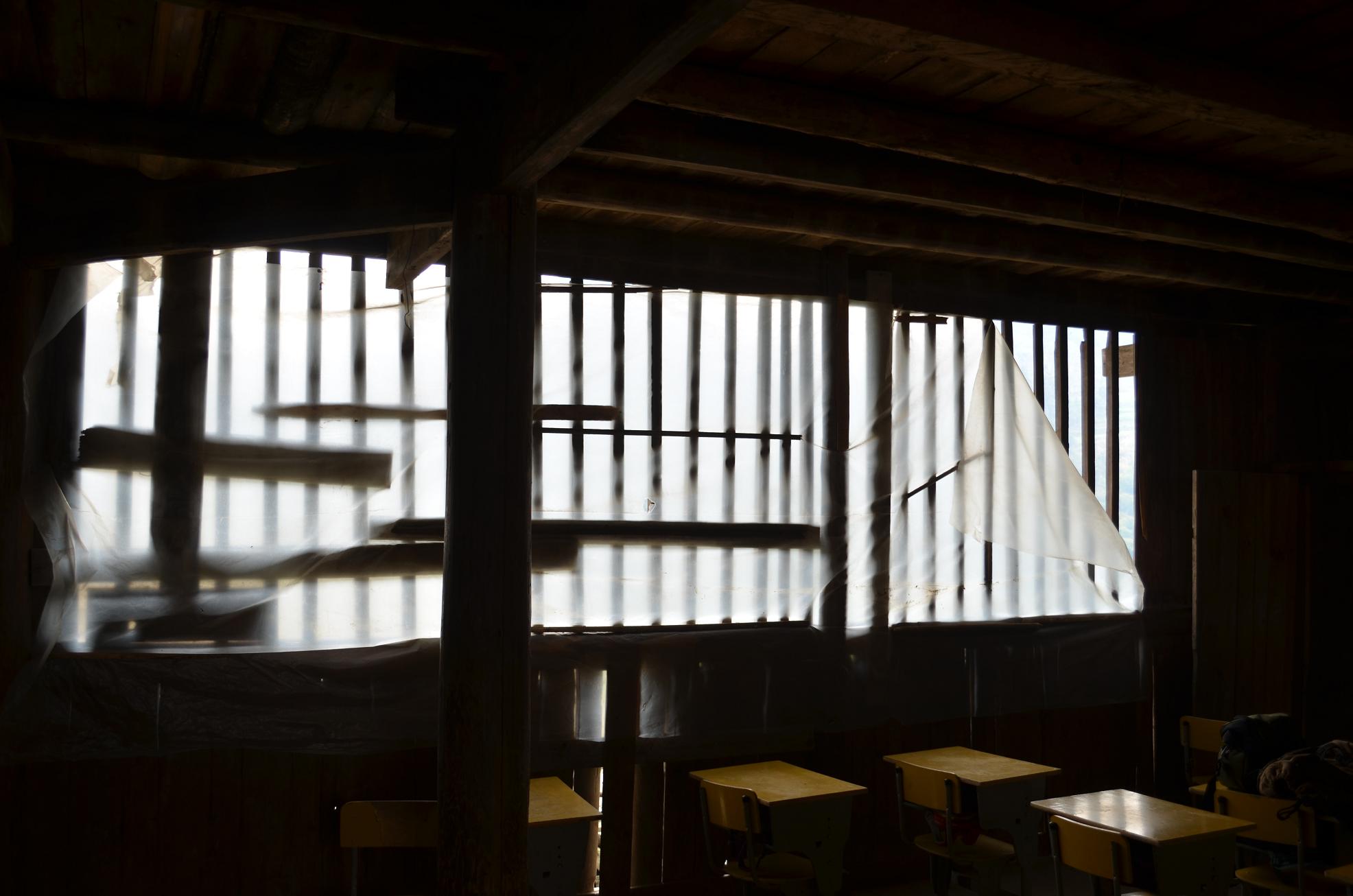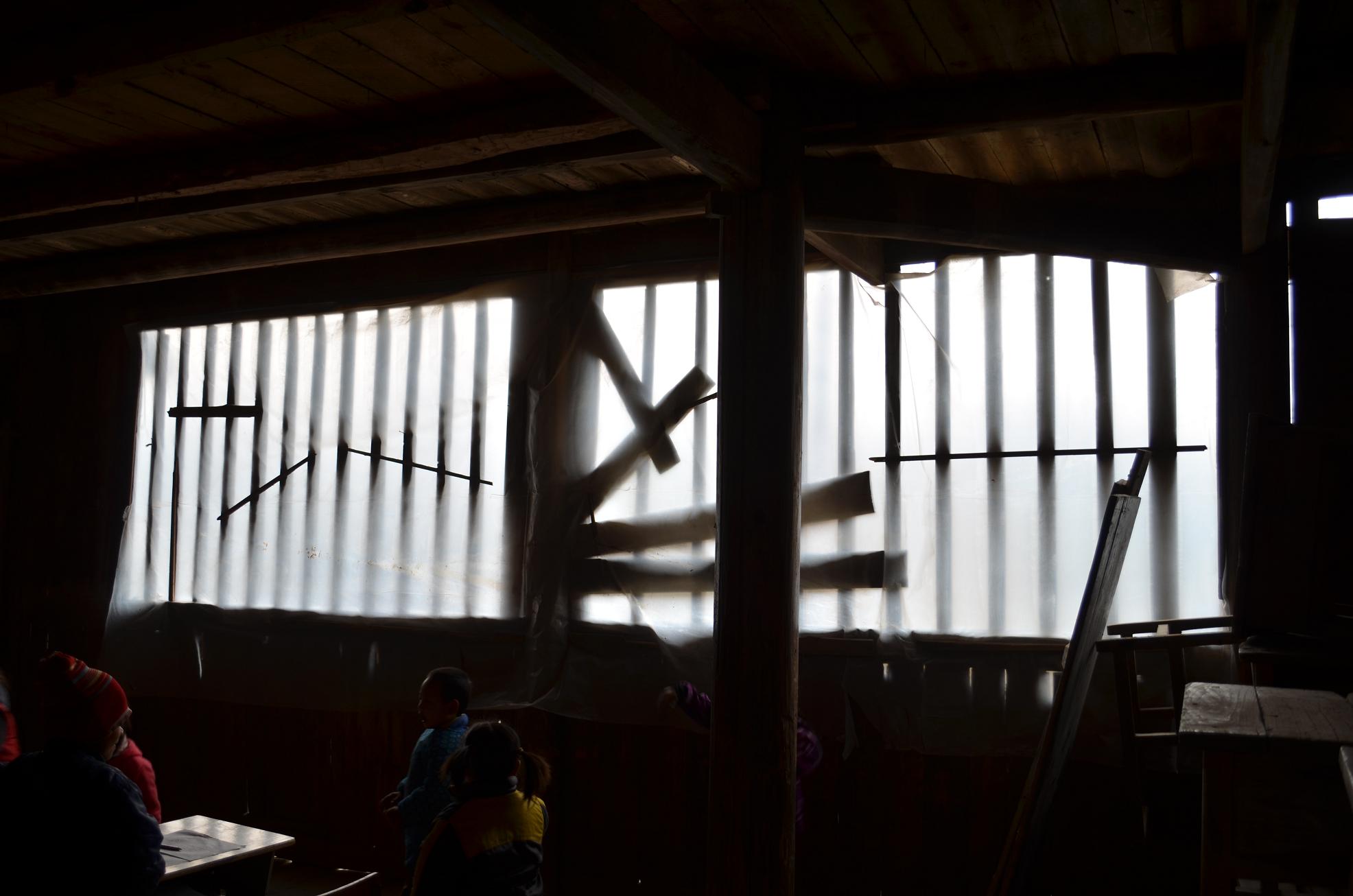 该教学点借用村里的一个老旧的木楼上课。该房老旧,年久失修,尤其教室的窗户是过去老式的木栅栏窗户,没有玻璃。冬季天冷的时候,用塑料布封挡,密闭性不好,而且塑料布和容易破碎。