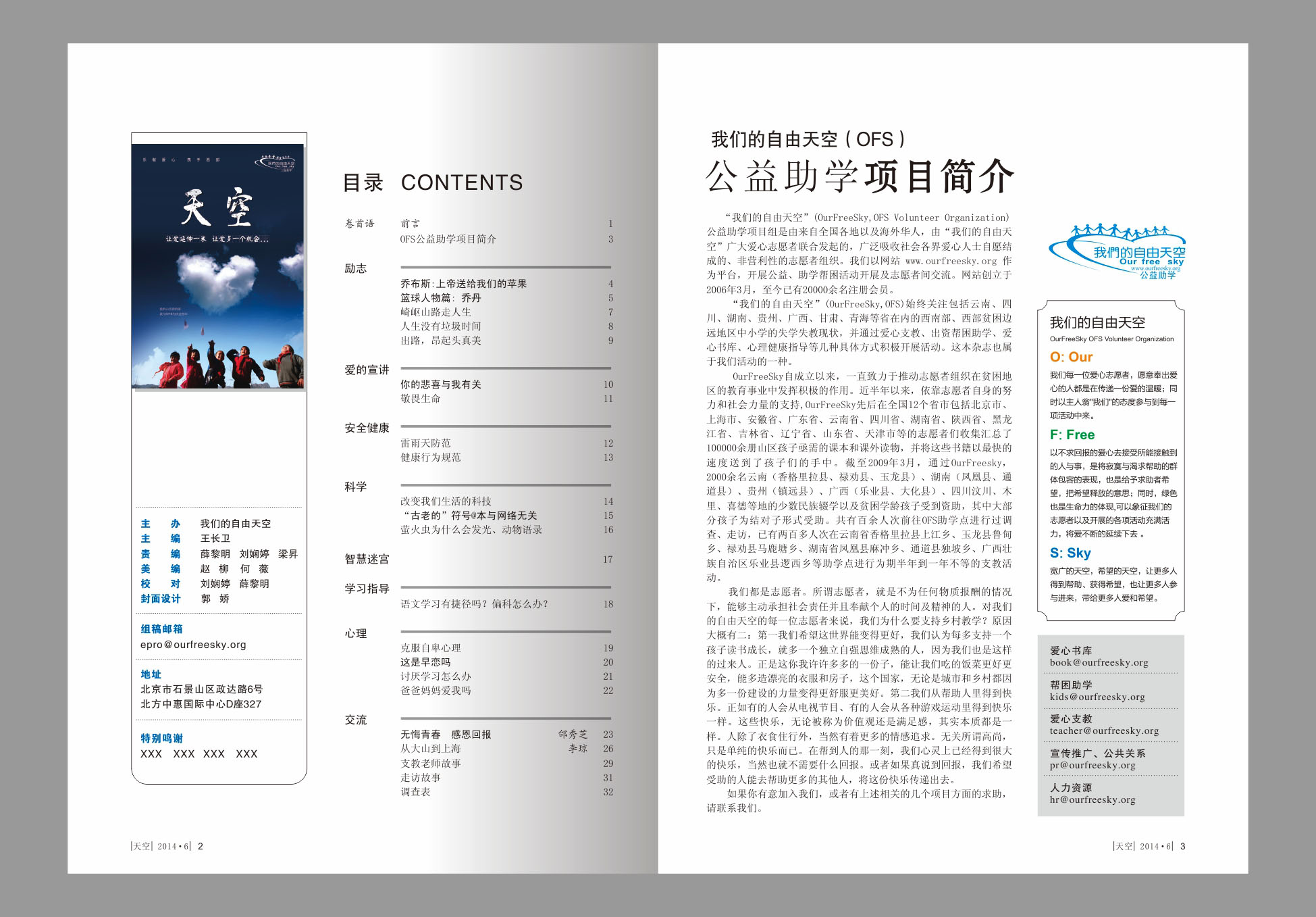 陆小兰:天空,原因:1.阅读者是我们支教点的学生,“我们的自由天空”他们也接触过了,有一定的理解,但是不深刻,这本长期的刊物以“天空”命名既可以让孩子简单地联想到是OFS,长期以后也能更加深刻地留在孩子的记忆里。像我们现在很多人都对《青年文摘》《读者》有深刻的记忆一样。2. .. (2014-07-01 11:18)