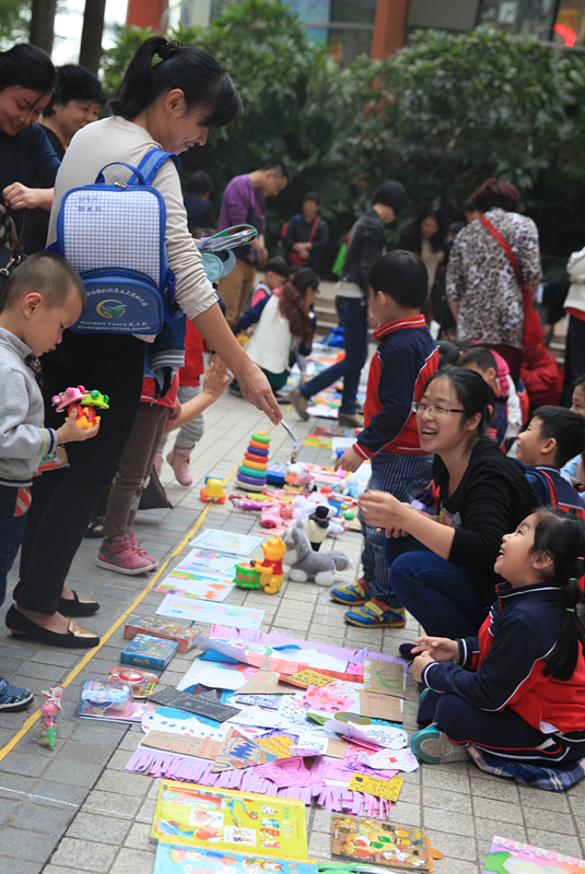 活动当天下午,孩子们站在广场上,用稚趣的童声唱响了爱的歌曲《伸出你的手》,让家长和行人倍受感动,随后孩子们大声喊出口号:“伸出你的手,让孟冲的小朋友有更好的未来!”宣布义卖活动开始。四十多个摊位绕场铺开,孩子们拿出自己的绘画作品,以及玩具和图书一一摆好,琳琅满目的作品吸引了很多家长和小朋友,活动现场人声鼎沸,络绎不绝的顾客忙坏了孩子们,他们大声地售卖,热火朝天地砍价,欢呼雀跃却又小心翼翼地把卖得得善款投进捐赠箱。