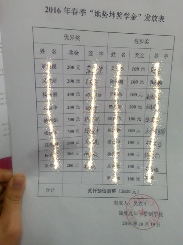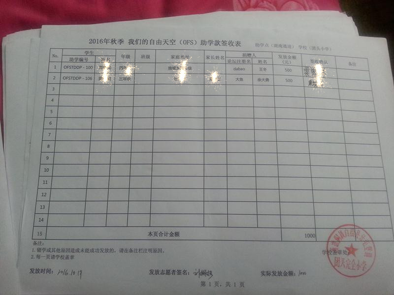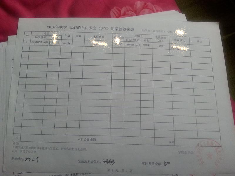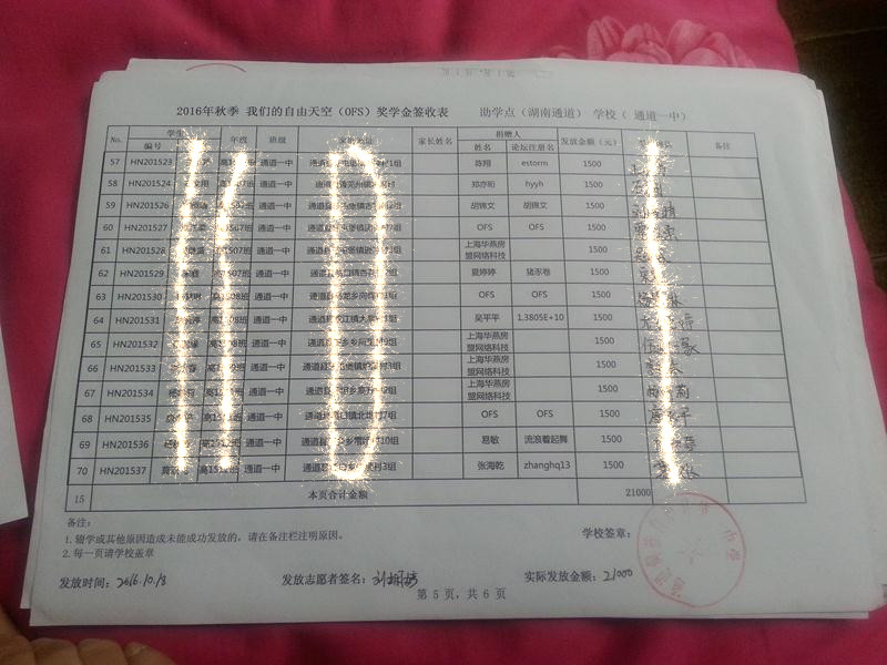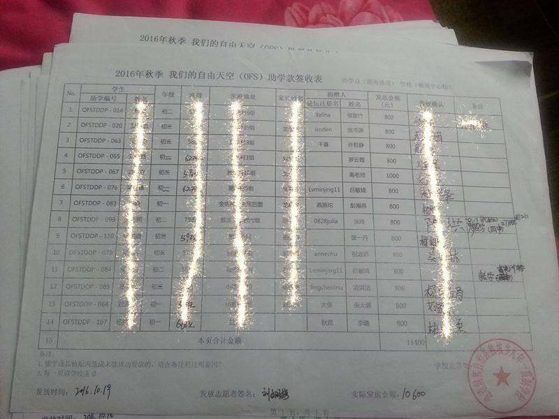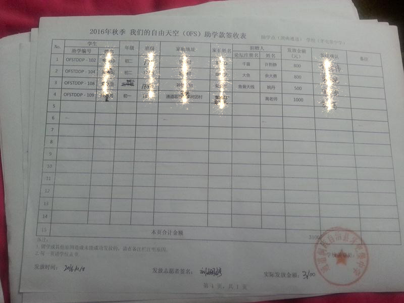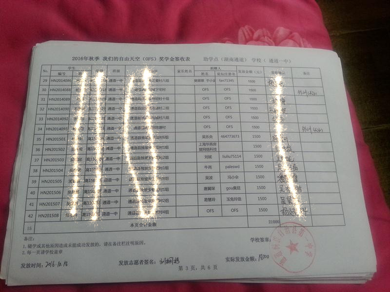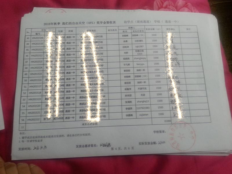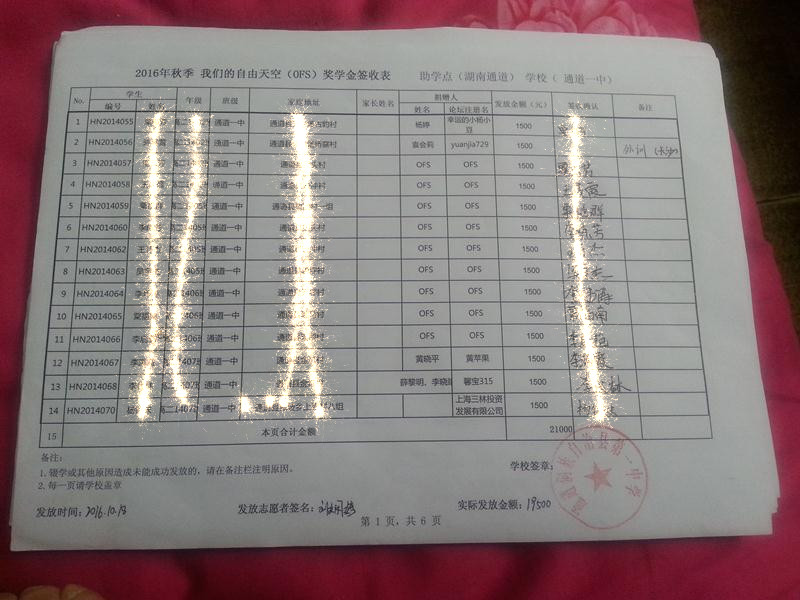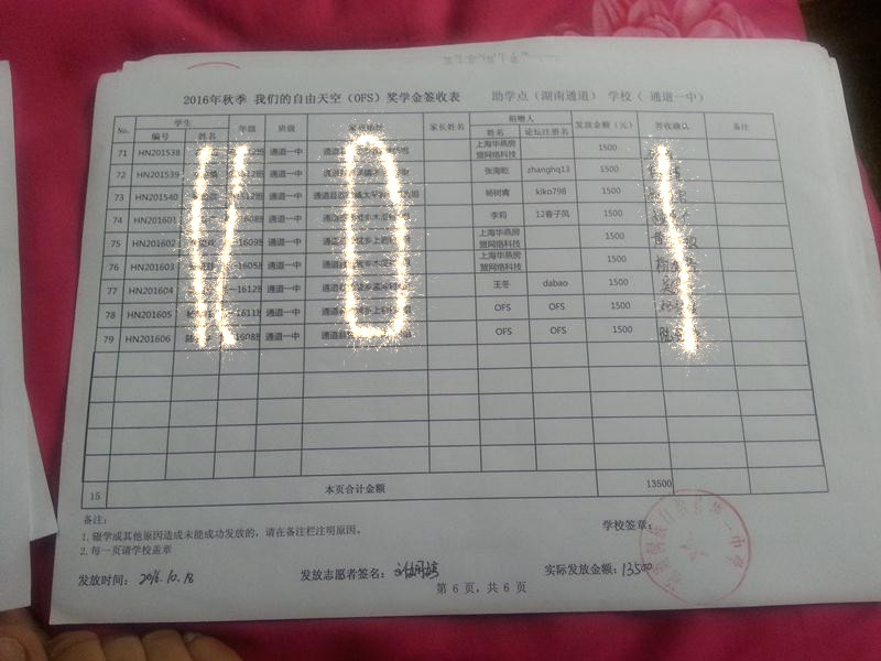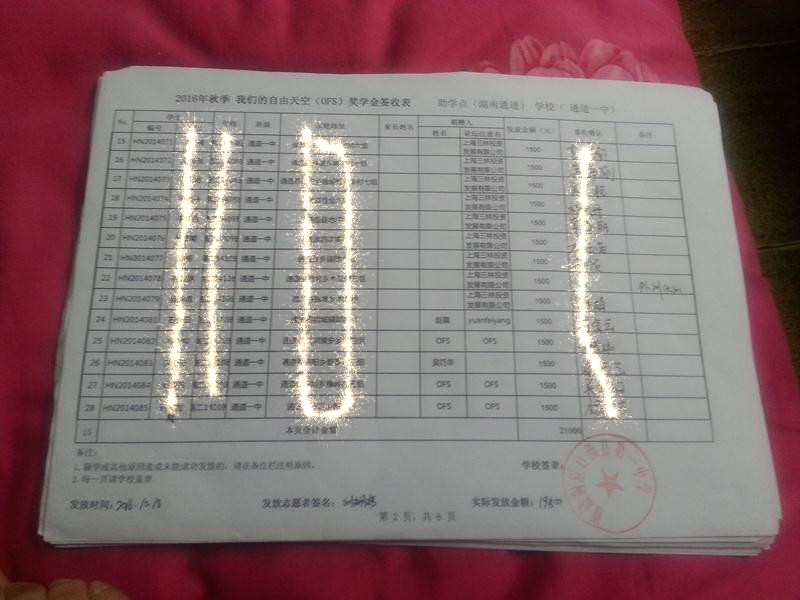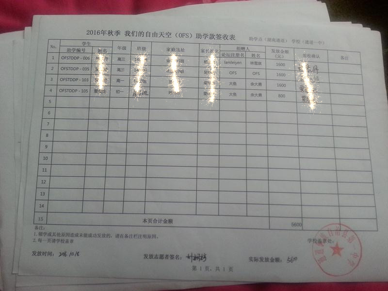2016年10月,经过OFS走访人员走访,在湖南通道共发放奖学金118500元(由于高三有4名特长生在北京和长沙集训,款项将会安排北京和长沙的志愿者去进行发放,发放完毕会在这个帖子下面跟帖签收表),助学金20800元,地势坤奖学金2800元,合计142100元。