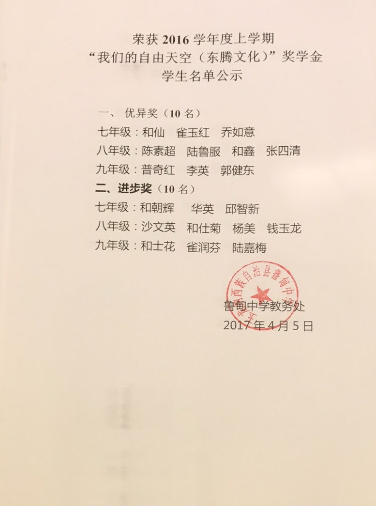 [公 示]2016学年下学期”我们的自由天空(东腾文化)“奖学金发放公示 [复制链接]