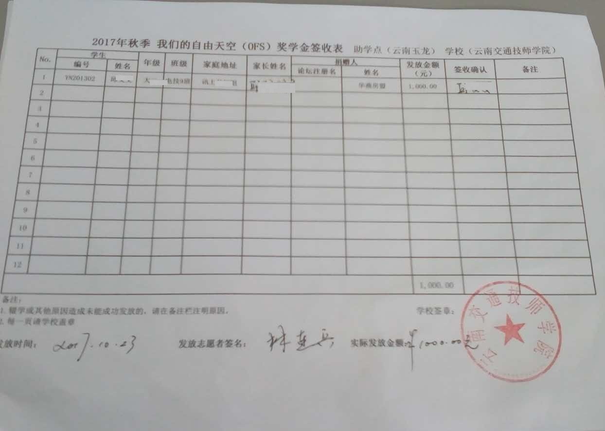 三、昆明地区奖学金发放情况:由昆明当地OFS志愿者林老师于10月24日发放