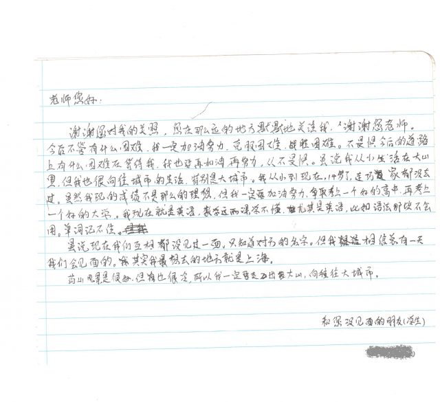 虽说我从小生活在大山里,但我也很向往城市的生活,特别是大城市。我从小到现在,14岁了,连巧家都没去过。虽然我现在的成绩不是那么的理想,但我一定要加油努力,争取考上一个好的高中,再考上一个好的大学。我现在就是英语、数学这两课学不懂,尤其是英语,比如语法那些不会用,单词记不住。