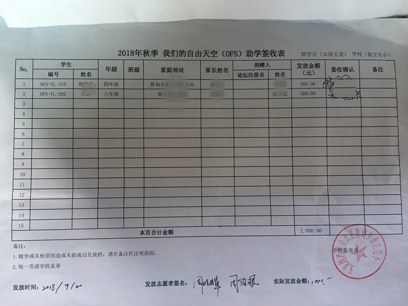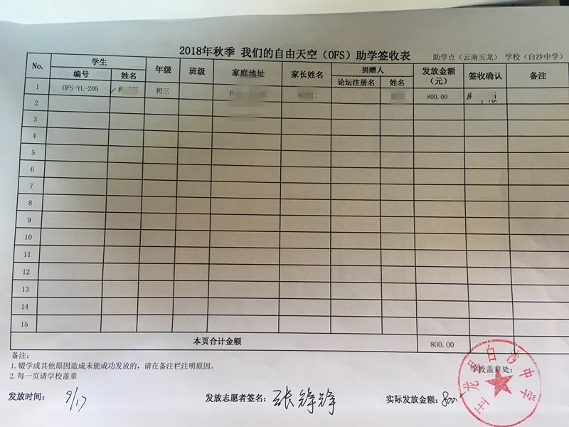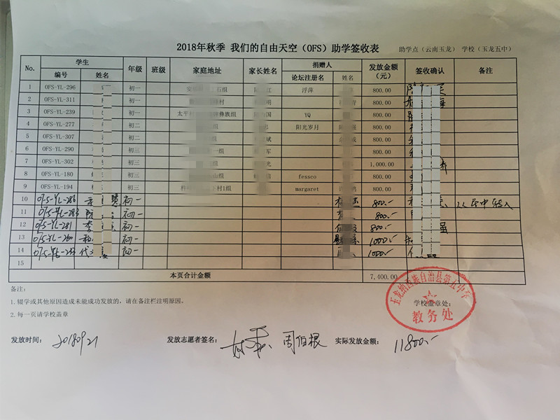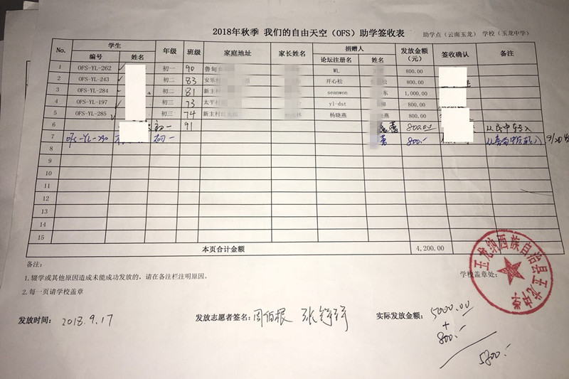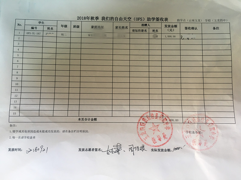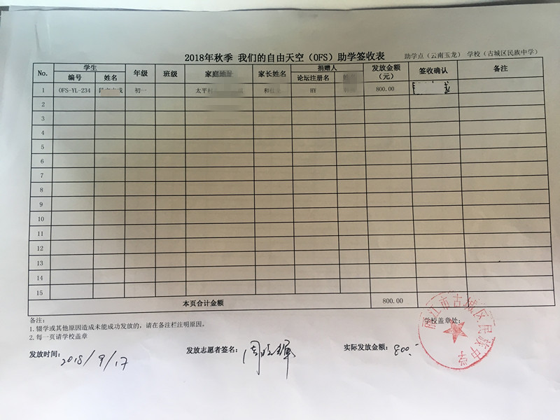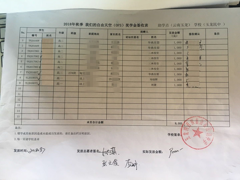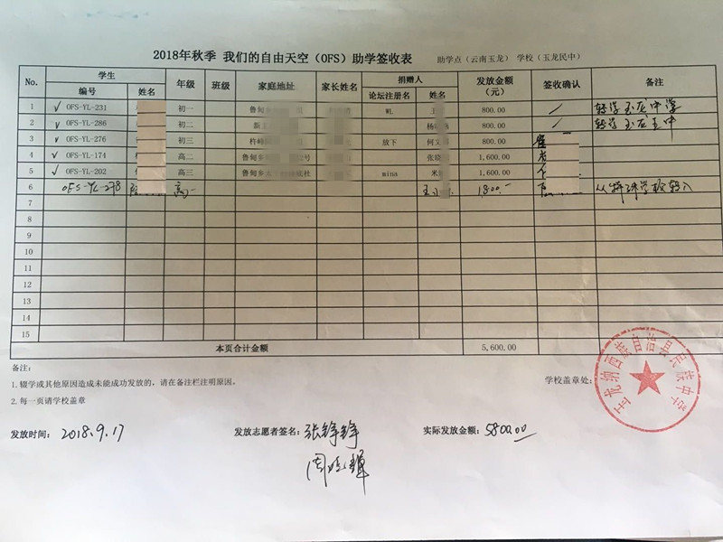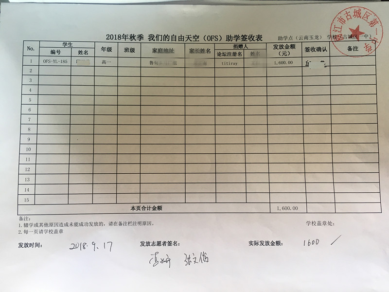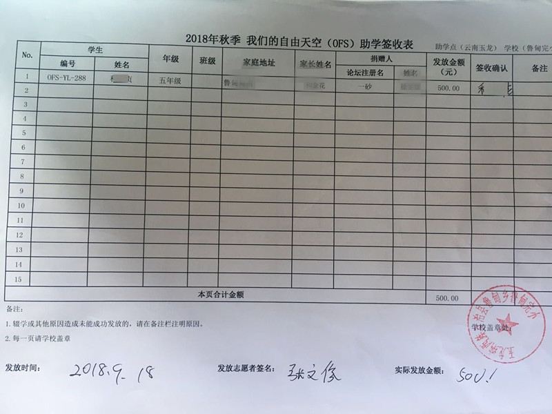 OFS走访志愿者在2018年9月17日-21日对云南省丽江市玉龙纳西族自治县及鲁甸乡助学点进行了走访工作,本帖针对玉龙助学点助学款发放工作做具体阐述。 !;Hi9,<#7g