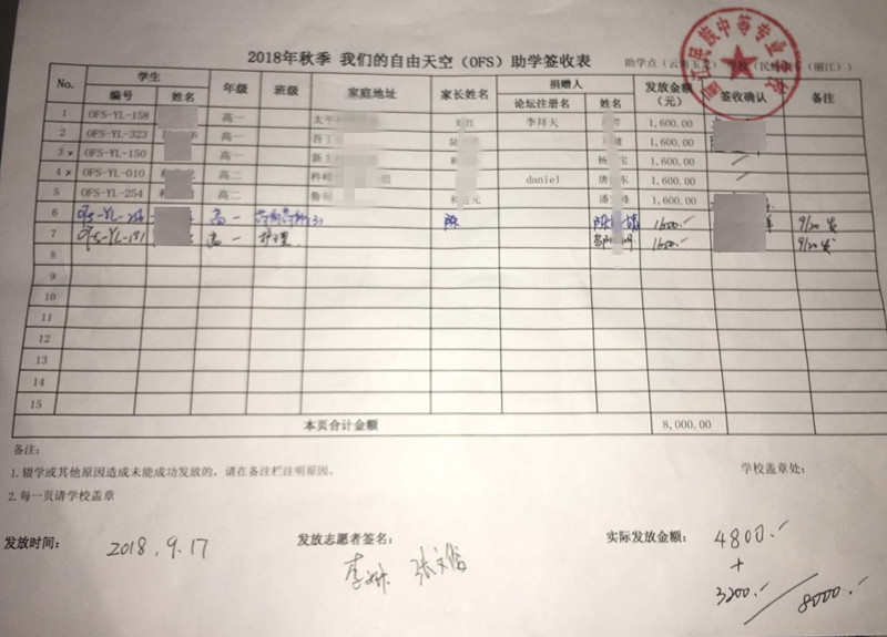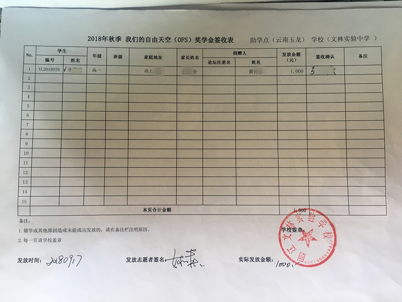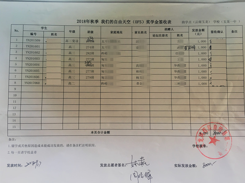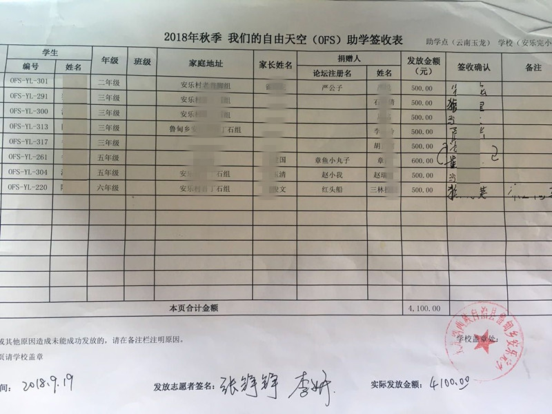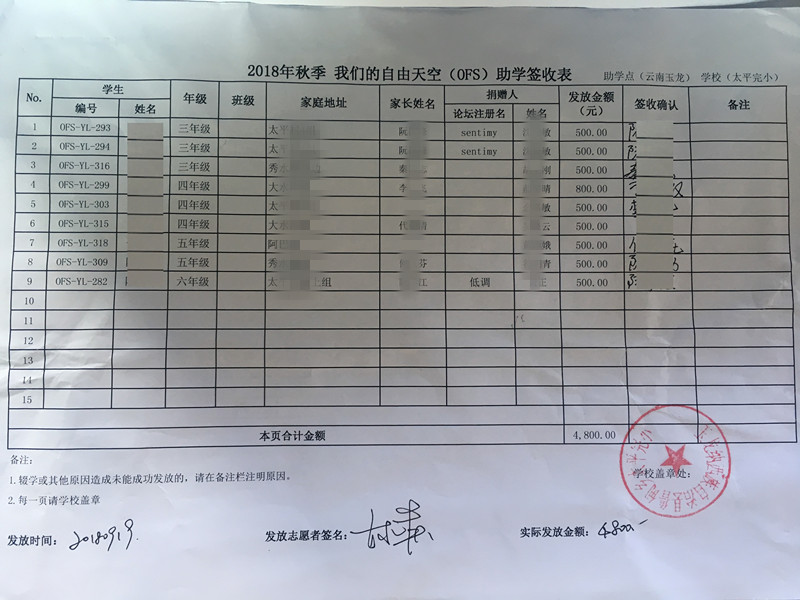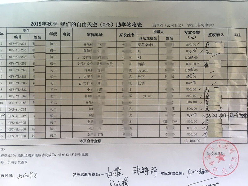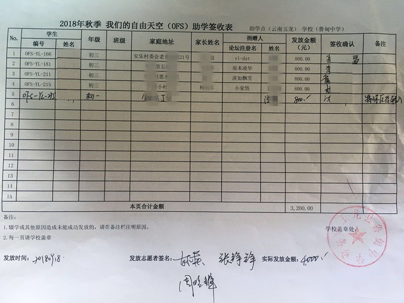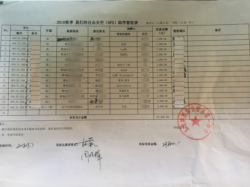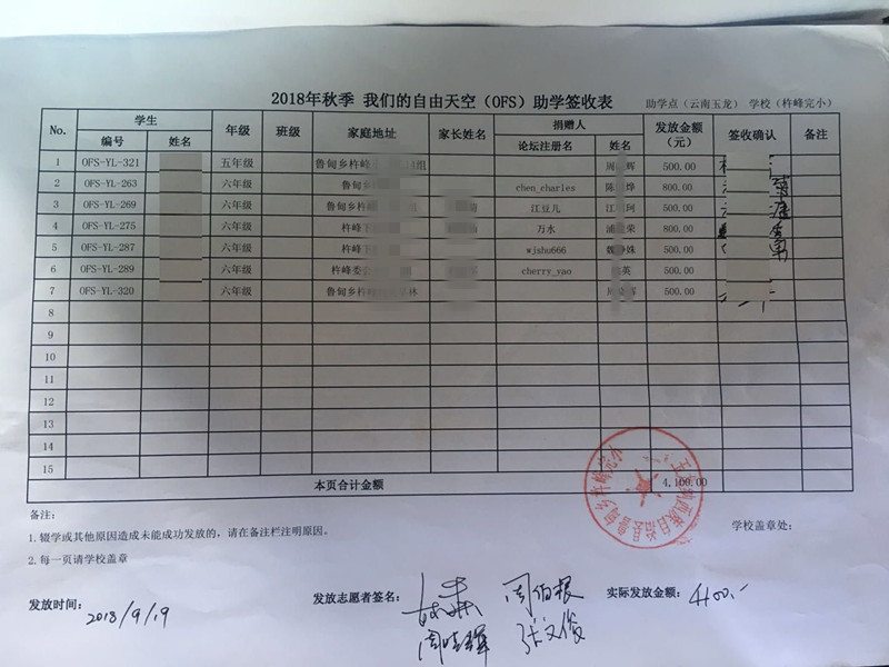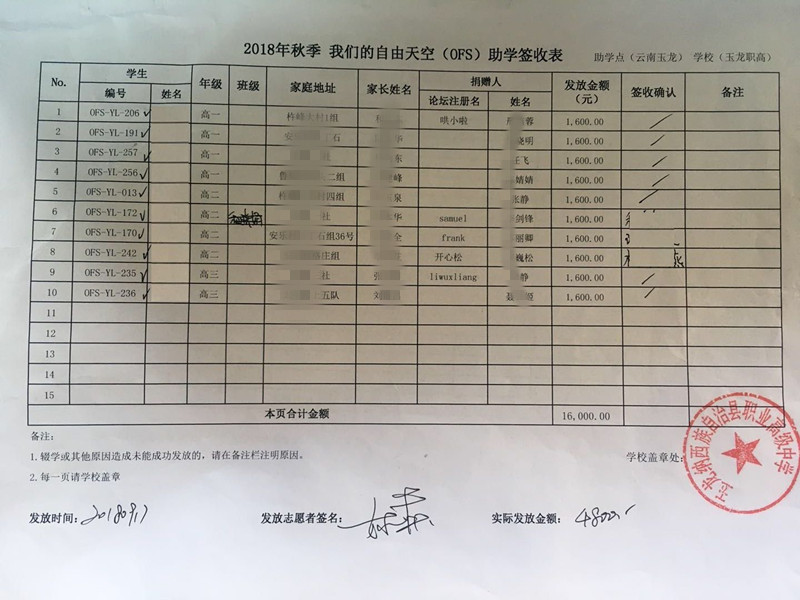 OFS走访志愿者在2018年9月17日-21日对云南省丽江市玉龙纳西族自治县及鲁甸乡助学点进行了走访工作,本帖针对玉龙助学点助学款发放工作做具体阐述。 !;Hi9,<#7g