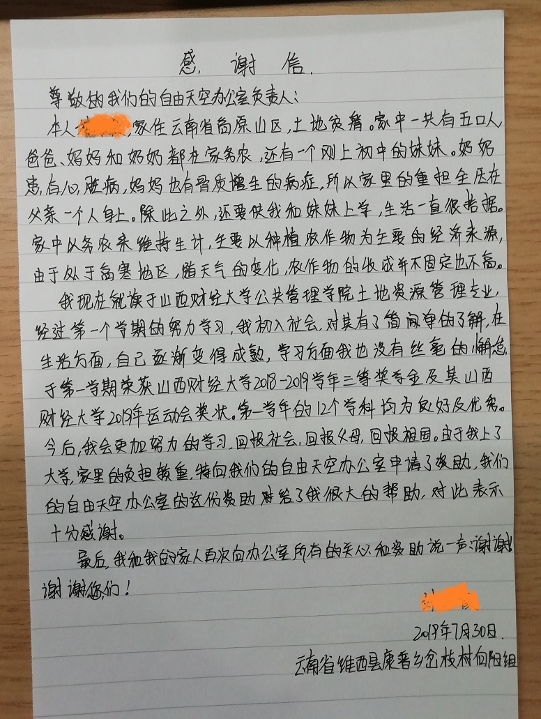 今后,我会更加努力的学习,回报社会,回报父母,汇报祖国。由于我上了大学,家里的负担较重,特向我们的自由天空办公室申请了资助,我们的自由天空的资助给了我很大的帮助,对此表示十分感谢。 I(R%j]LX&