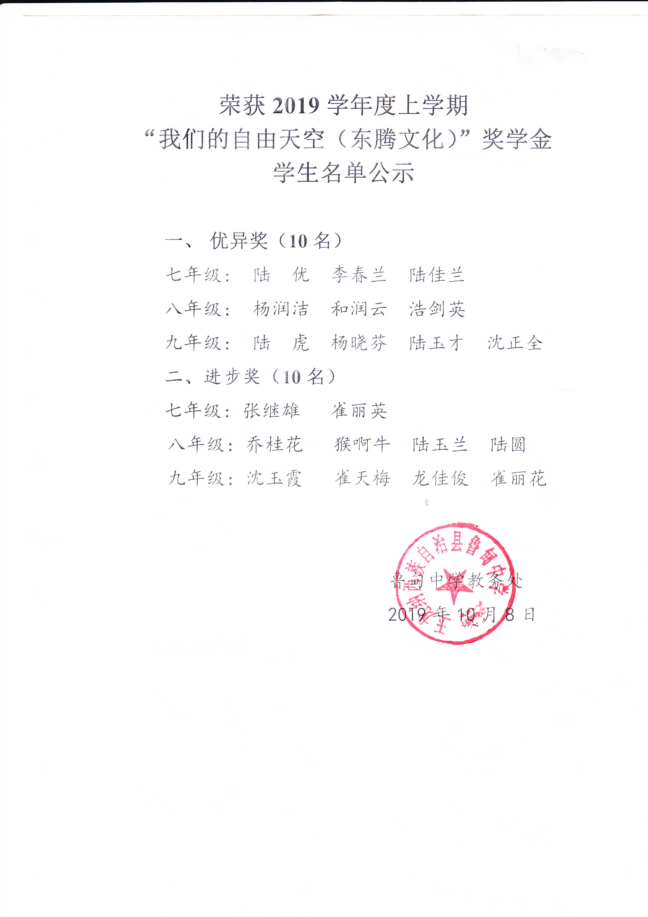 [公 示]2019年秋季”我们的自由天空(东腾文化)“奖学金发放公示 [复制链接]