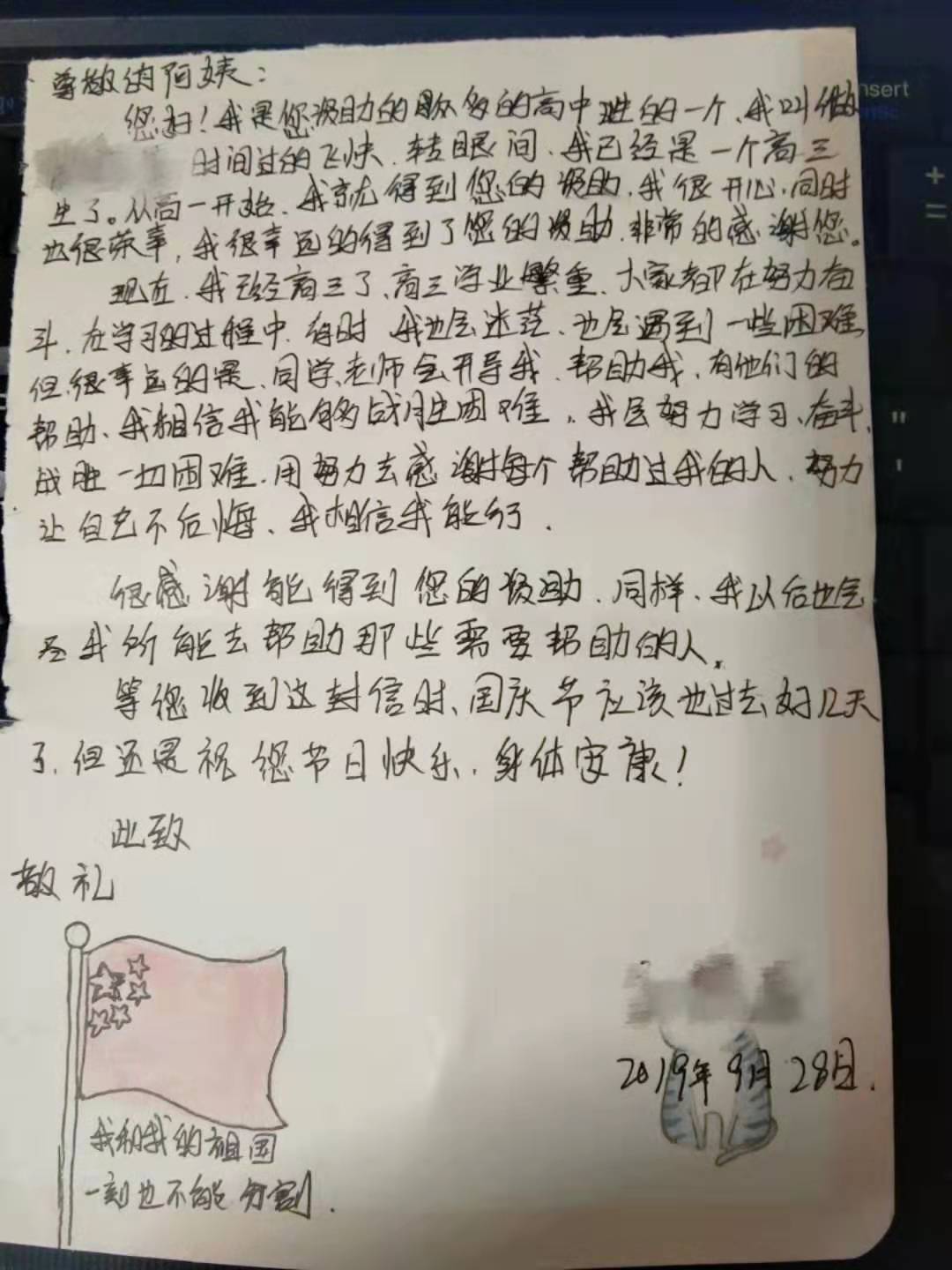 您好!我是您资助的众多的高中生的一个,我叫做小洁(化名),时间过的飞快,转眼间我已经是一个高三生了。从高一开始,我就得到您的资助,我很开心,同时也很荣幸,我很幸运的得到了您的资助,非常的感谢您。