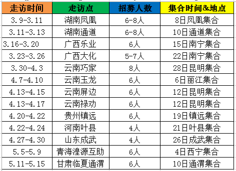 请申请人注意上述时间是走访工作的时间,不包括您从驻地到助学点路上的时间,请各位根据自己方便,前后预留到达时间。助学点的集合时间多为走访工作开始的前一天,部分助学点因路程较远提前两天集合(从集合地点到助学点需时较长)。