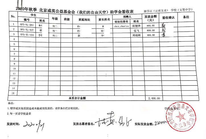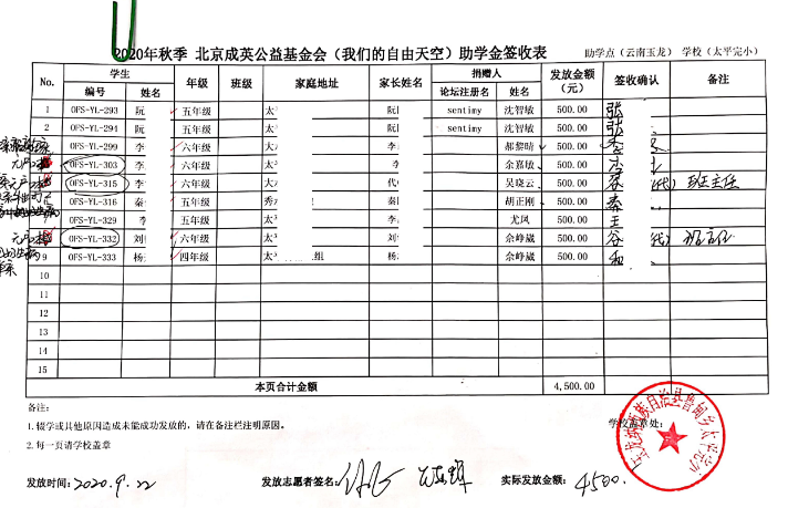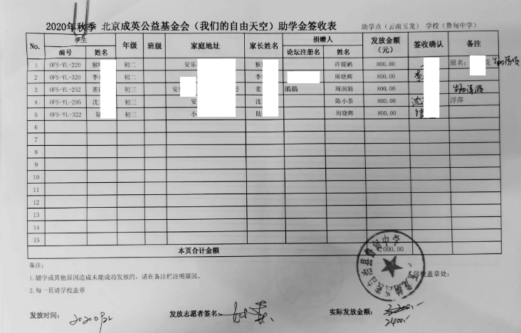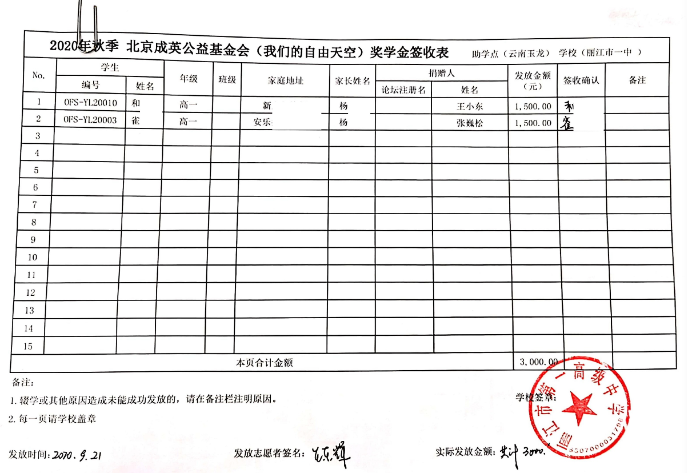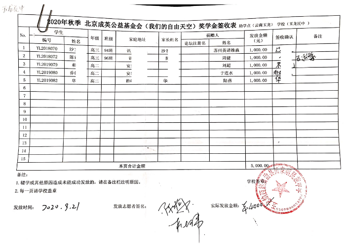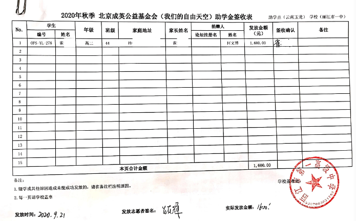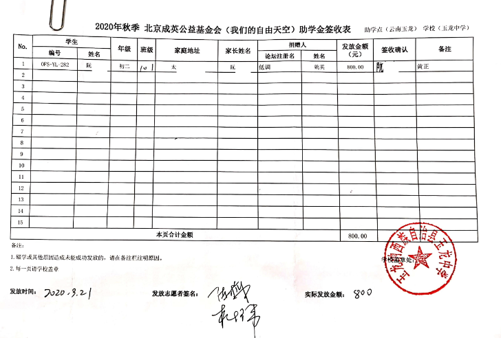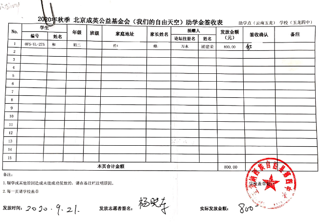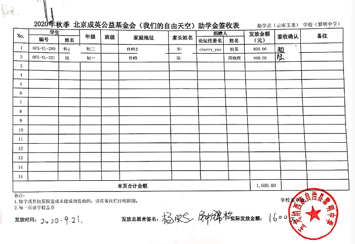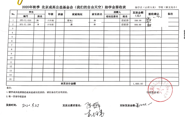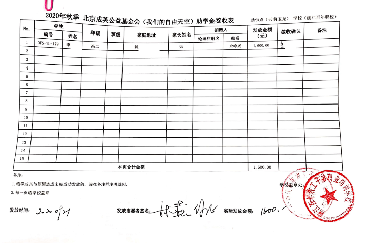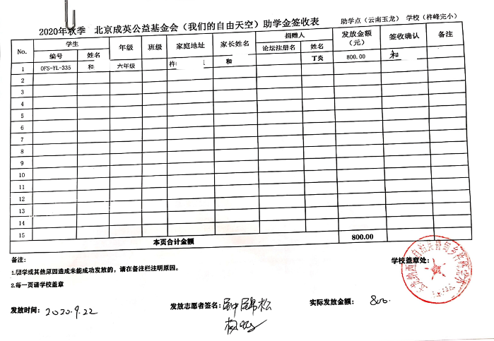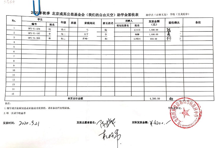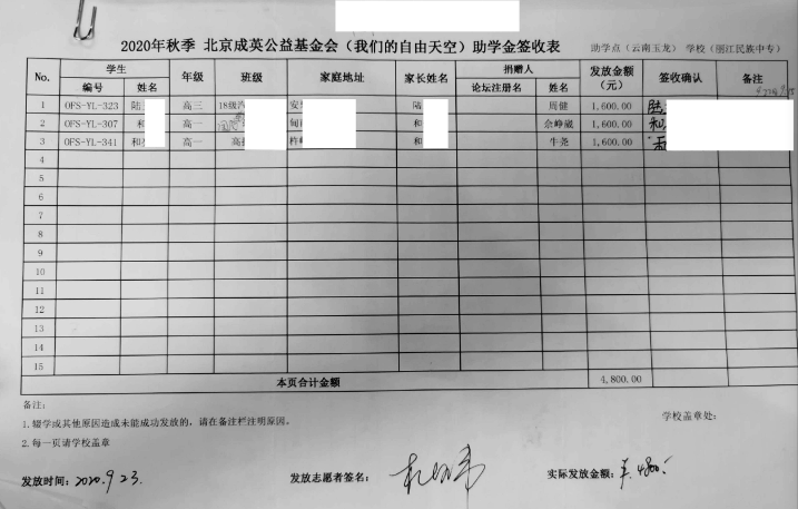 OFS走访志愿者在2020年9月21日-23日对云南省丽江市玉龙纳西族自治县及鲁甸乡助学点进行了走访工作,本帖针对玉龙助学点助学款发放工作做具体阐述。