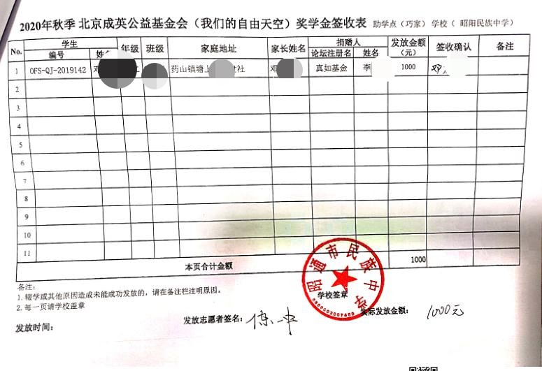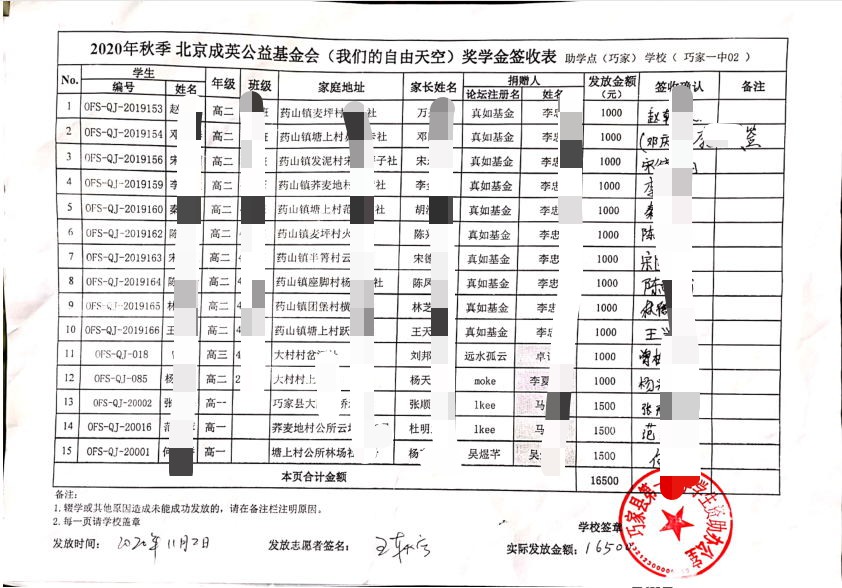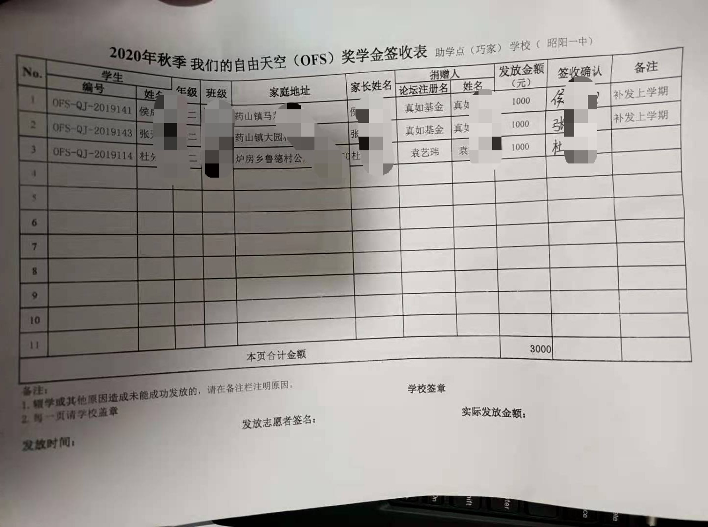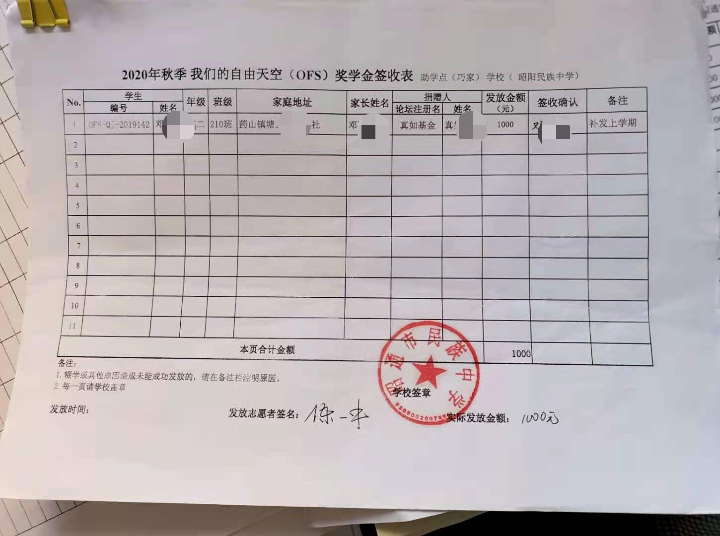 2020年秋季巧家走访在11月2日至5日,OFS志愿者历经4天的走访完成了秋季奖(助)学金的发放工作和初升高奖学金新增学生的家访工作,感谢每位走访志愿者的付出和辛苦!感恩每位资助人对孩子们的关注和支持!具体发放情况如下:   >a] s