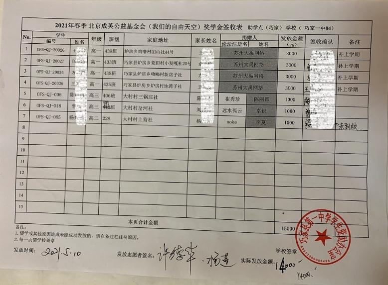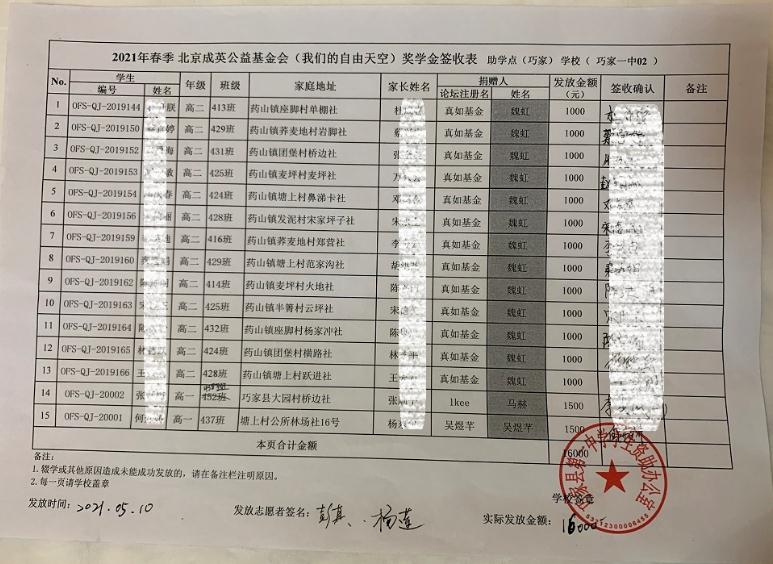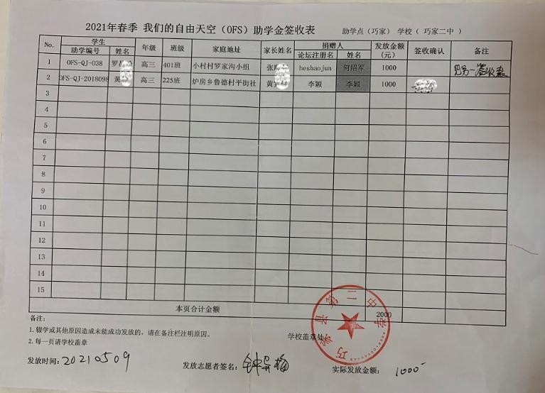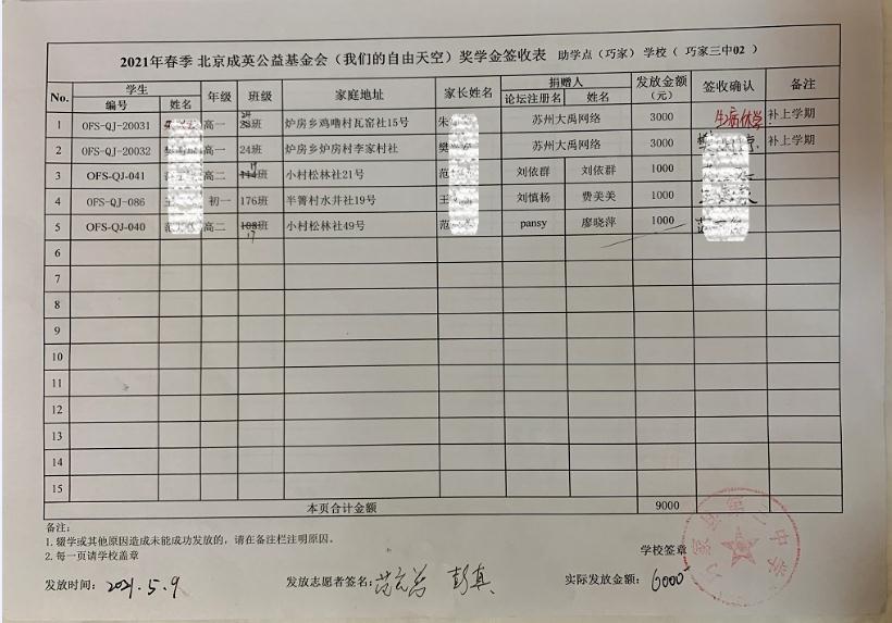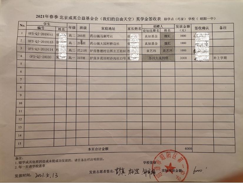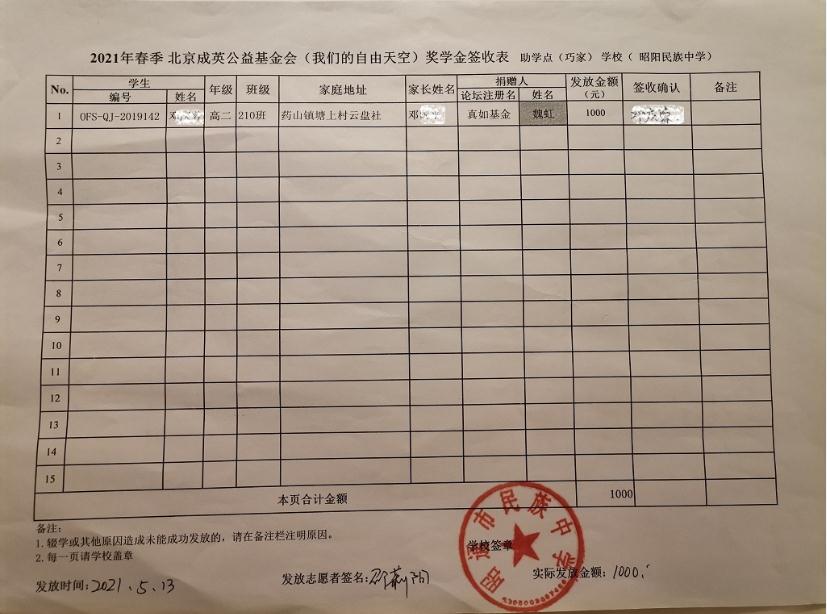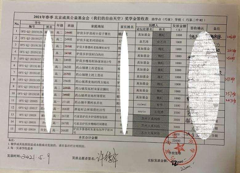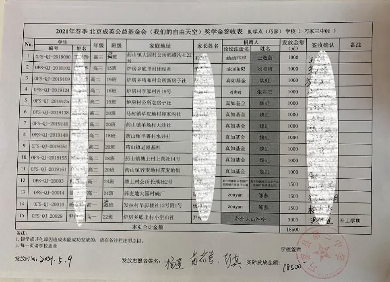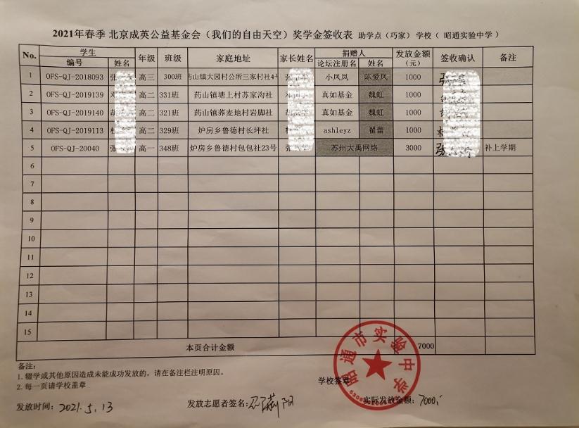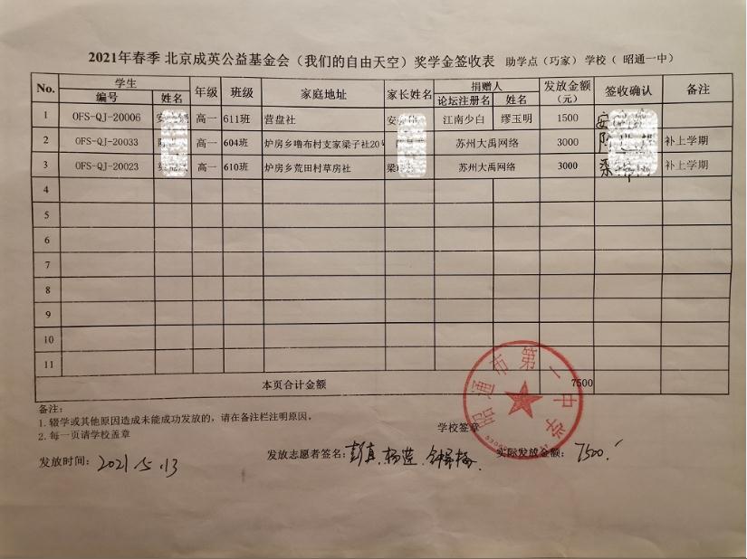 2021云南巧家春季走访已于5.9-5.14完成,OFS志愿者历经5天的走访完成了秋季奖(助)学金的发放工作和初升高奖学金新增学生(面访和家访44名学生)的家访工作,感谢每位走访志愿者的付出和辛苦!感恩每位资助人对孩子们的关注和支持!具体发放情况如下:   .db:mSrL