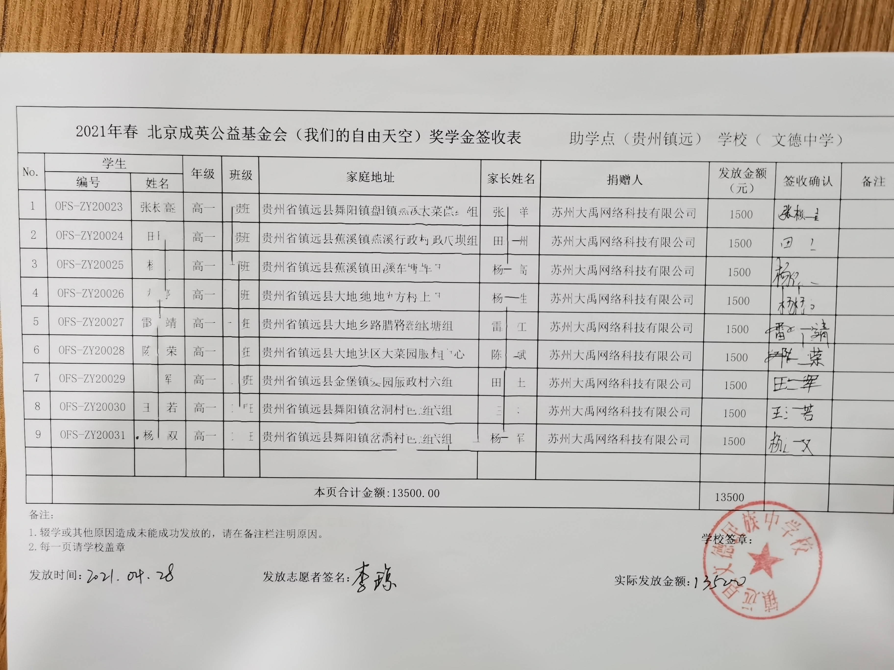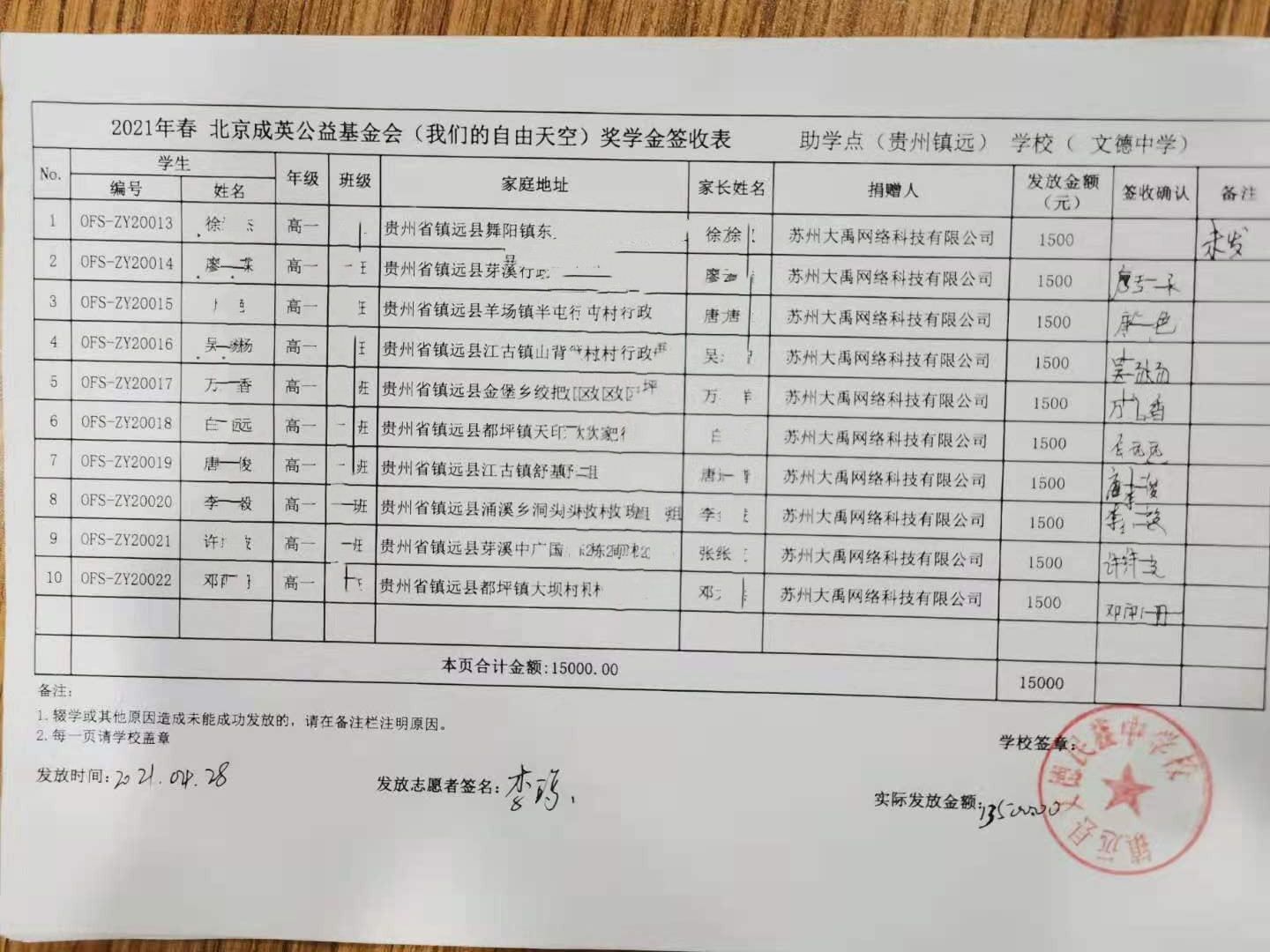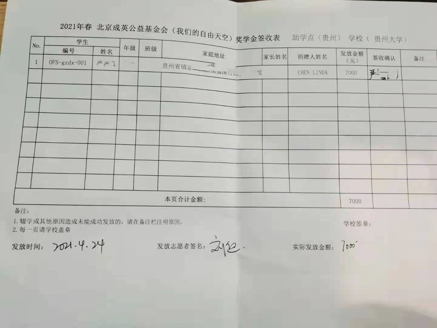 贵州镇远2021年春季奖助学金发放于4月26日-30日顺利发放完成。