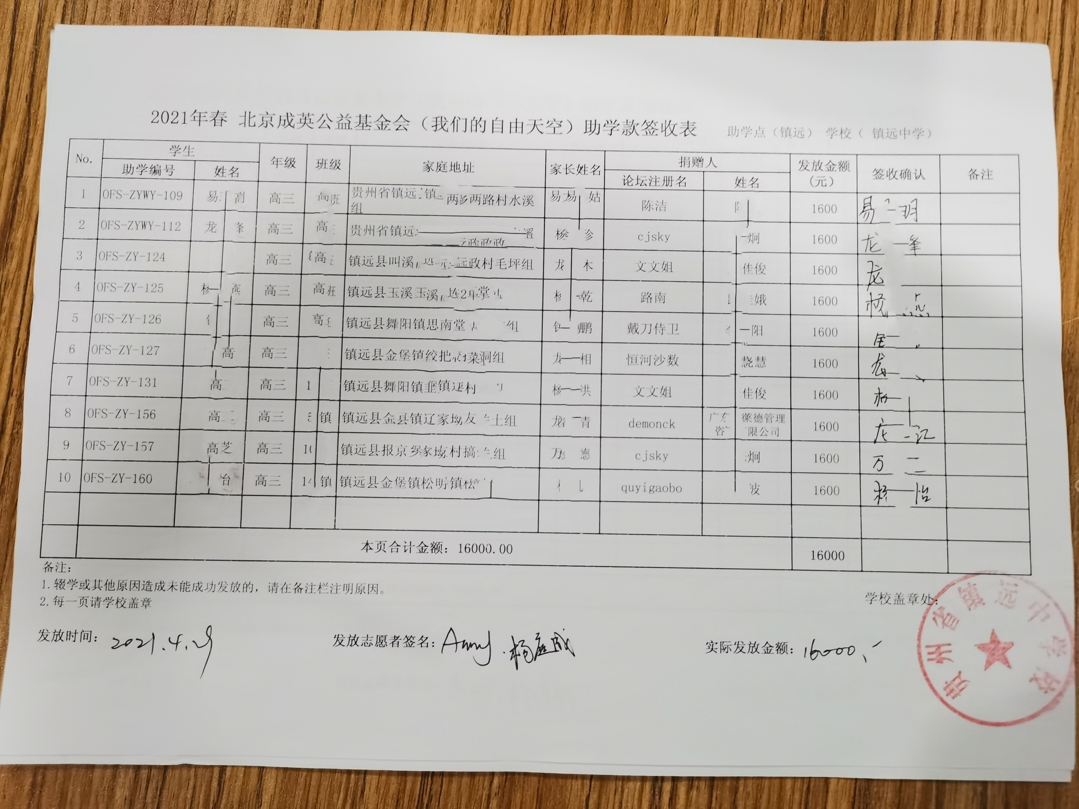 为保护学生隐私,签收表抹去学生姓名,学生资料将近期发送到资助人邮箱,如有疑问,请咨询zhenyuan@ourfreesky.org或者kids@ourfreesky.org