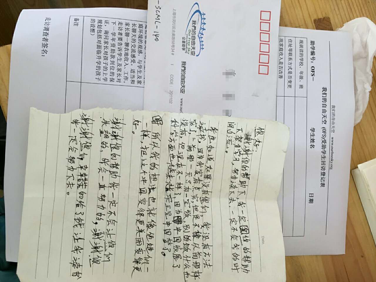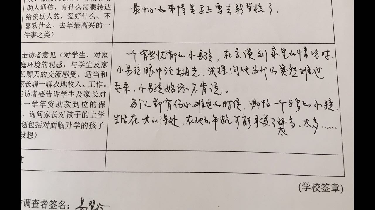 在和这些初中高中阶段的学生谈话中我了解到,他们学习勤奋,他们知道父母辛苦,知道自己到县城读书不易,一个叫次麻的高一女孩说起哥哥外出打工把读书机会给了自己时声音哽咽。每个人都希望升学,希望考上大学,希望将来有个好工作让家里人过上好日子,可实际情况却是,由于孩子们来自偏远的俄亚,基础差,学习普遍吃力,成绩并不突出。令人欣慰的是他们没有放弃自己,并且每个人都对资助人表达了由衷的谢意。我不知道他们以后能否如愿地升学或考上大学,我想作为资助人能不能理解到,并不是孩子得到了帮助就不会辍学,也并不是孩子得到了帮助成绩就必须好,大山里的孩子的求学之路比我们想象的还要艰辛,最近热传的哈佛毕业典礼演讲者何江的故事虽然令人振奋,但毕竟是个特例。所以我想对我资助的通道的学生说,如果你读下去,阿姨很高兴,如果你不读了,阿姨也尊重你的选择。