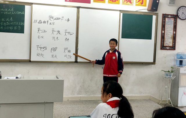 在文字教学及绘画教学过程中,教导学生不仅会认读字词,而且理解字义,最后师生合作写出漂亮的东巴文,这样的课程模式不仅有效培养了孩子的想象力和观察力,同时还增强了孩子对纳西文化的记忆力。
