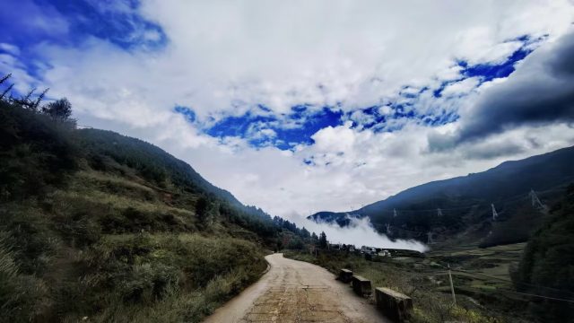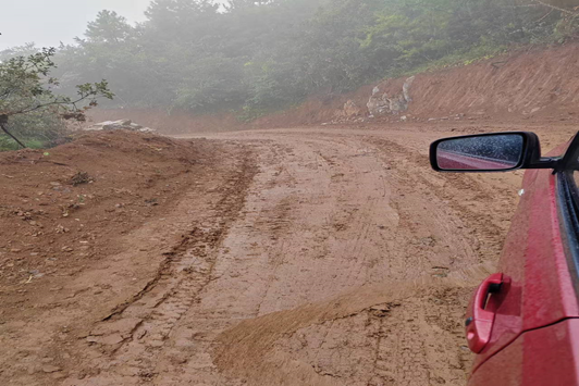 接下来又去了两个同村比较近的学生家里,也深入了解了各自的情况之后,大约已是下午两点多。还有两家是位于回程路上的另一个叉路方向,于是赶紧找到那个叉路口,准备爬坡上去。可不巧的是,这时候天下起了小雨,而且刚入路口有块牌子写着“前方路段硬化施工,禁止通行”。我们抱着试试看的心态,想坚持一下。经过前面两三个湿滑的转弯路面之后,李书记已经猛打方向盘反复走了好多个S形路线之后,感觉已经很累了。期望过下一个弯之后能够顺利,可这时候雨下得大起来了,泥泞的路面更滑了,李书记没有放弃,准备再冲刺一下。结果又经过4、5次S形冲刺之后,还是退了下来。我和郑队长想下车试试帮着推车,被李书记阻止了,路上满是泥泞确实也有危险。之后郑队长和OFS办公室人员沟通之后,决定返回。看着李书记满头大汗,如此努力,我心里又多了一分对他的敬意。
