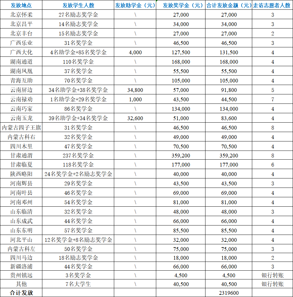 2024年OFS秋季助学走访活动,自9月初开启,至2025年1月初圆满完成。在这个秋季,有来自全国各地110余名志愿者小O们参与助学走访活动,走访了OFS的26个助学项目点,累计发放奖学金、助学金2,319,600万元,发放奖、助学金学生 1549人,走访新增学生360余人;发放教师奖励120人,发放教师奖励金8万元。