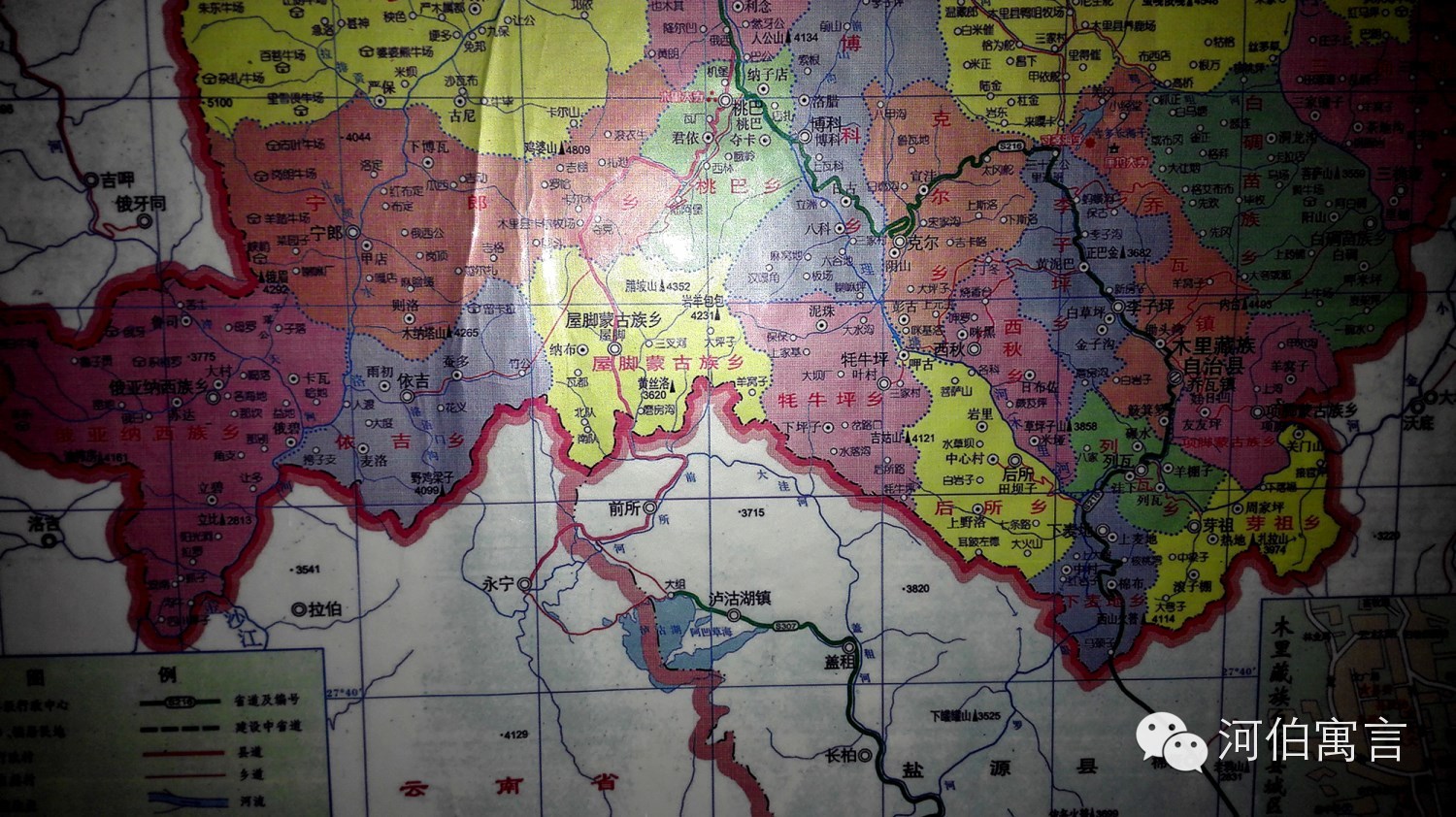 (一天时间,折线穿行,从右边木里县城到达左边的俄亚,似乎也是民族的迁徙与混居的历史浏览)
