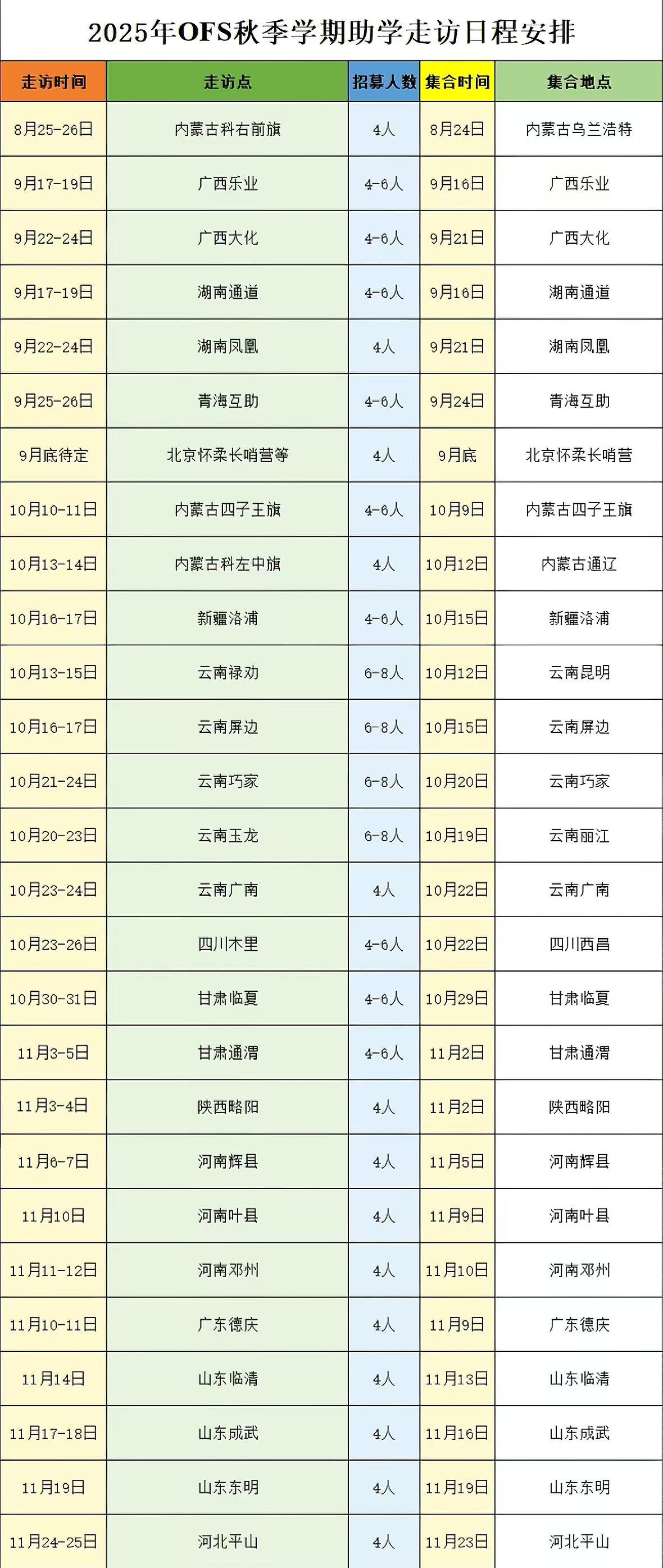 请申请人注意,上述时间是走访工作的时间,不包括您从驻地到项目点路上的时间,请各位根据自己方便,前后预留到达时间。项目点的集合时间多为走访工作开始的前一天,部分项目点因路程较远,需提前两天集合(从集合地点到助学点需时较长)。