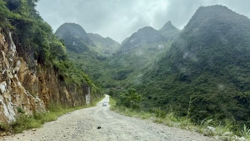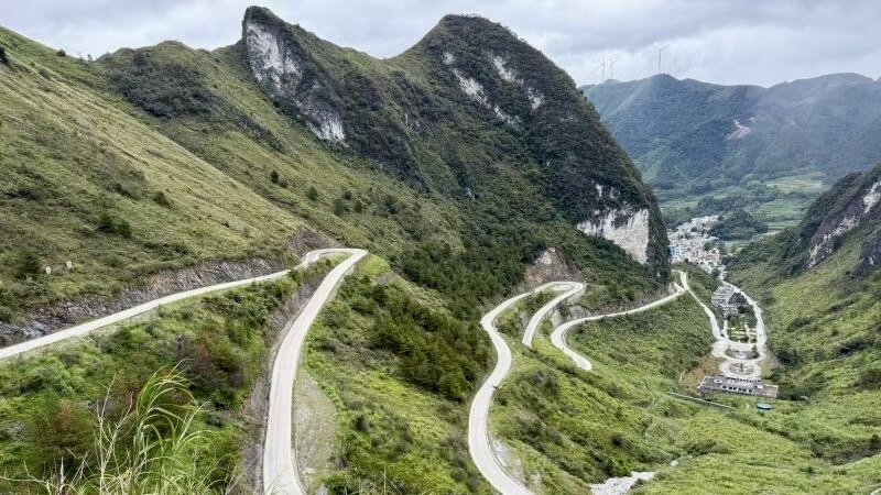 次日一早来自北京的史老师开车,我们一行四人前往七百弄实验学校。车子刚驶出大化县城,窗外的风景便换了模样,平坦的柏油路渐渐拐进山间,两侧的喀斯特峰丛如画卷般徐徐展开——不再是远处朦胧的轮廓,而是近在咫尺的奇崛,有的峰岩青灰表面爬着深绿的藤蔓,像披了件斑驳的绿衫,有的则裸露着赭红色的岩层,纹路如刀削斧凿,仿佛藏着亿万年的时光印记。