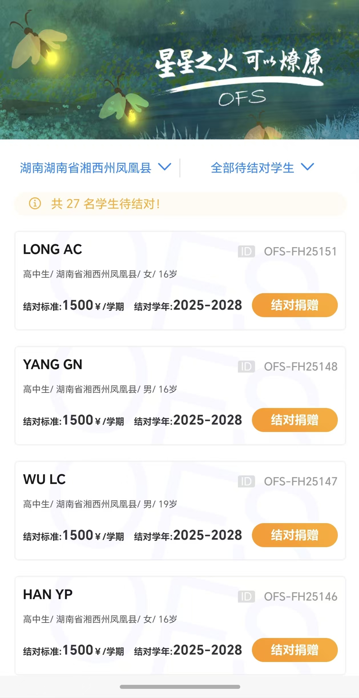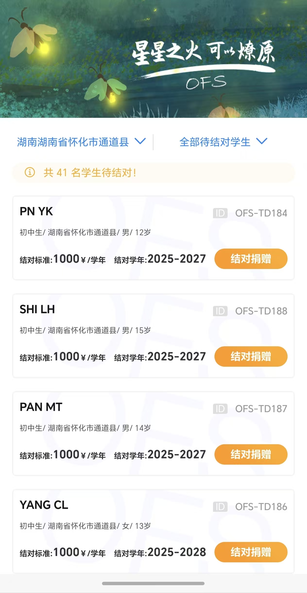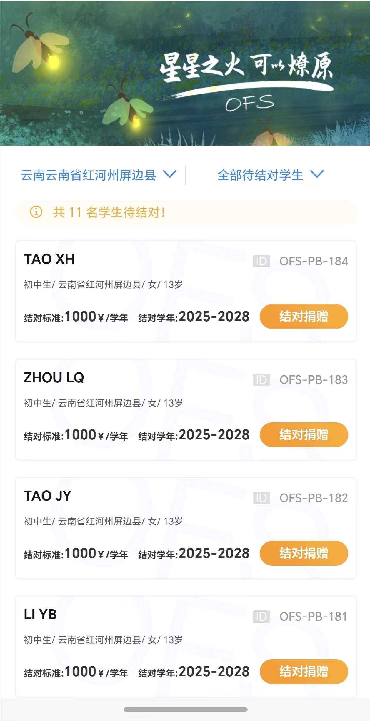他们有初升高奖学金学生,也有在义务教育阶段需要助学金的学生。他们来自湖南通道、湖南凤凰、广西乐业、内蒙古四子王旗、云南屏边、云南禄劝、云南巧家、云南玉龙、广西乐业、甘肃通渭、河南辉县、河北平山、陕西略阳等项目点。 如果您有意向结对或宣传扩散给更多爱心人士,让这些学生能顺利完成学习,请扫描下方小程序二维码,结对学生。