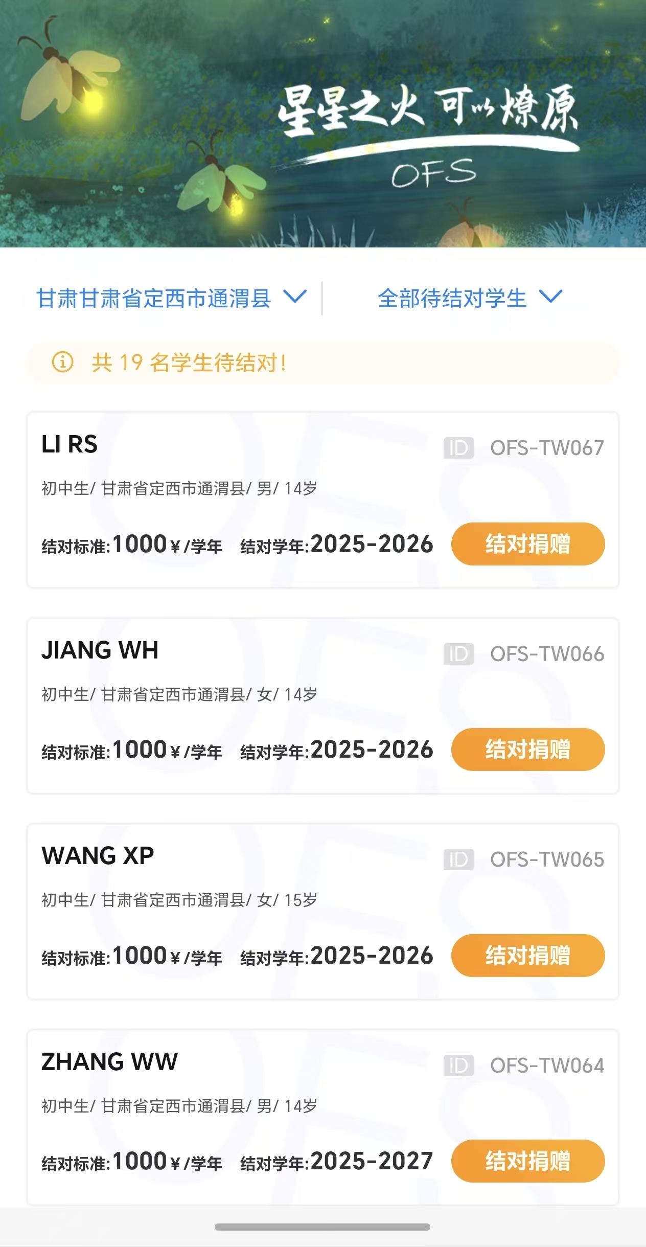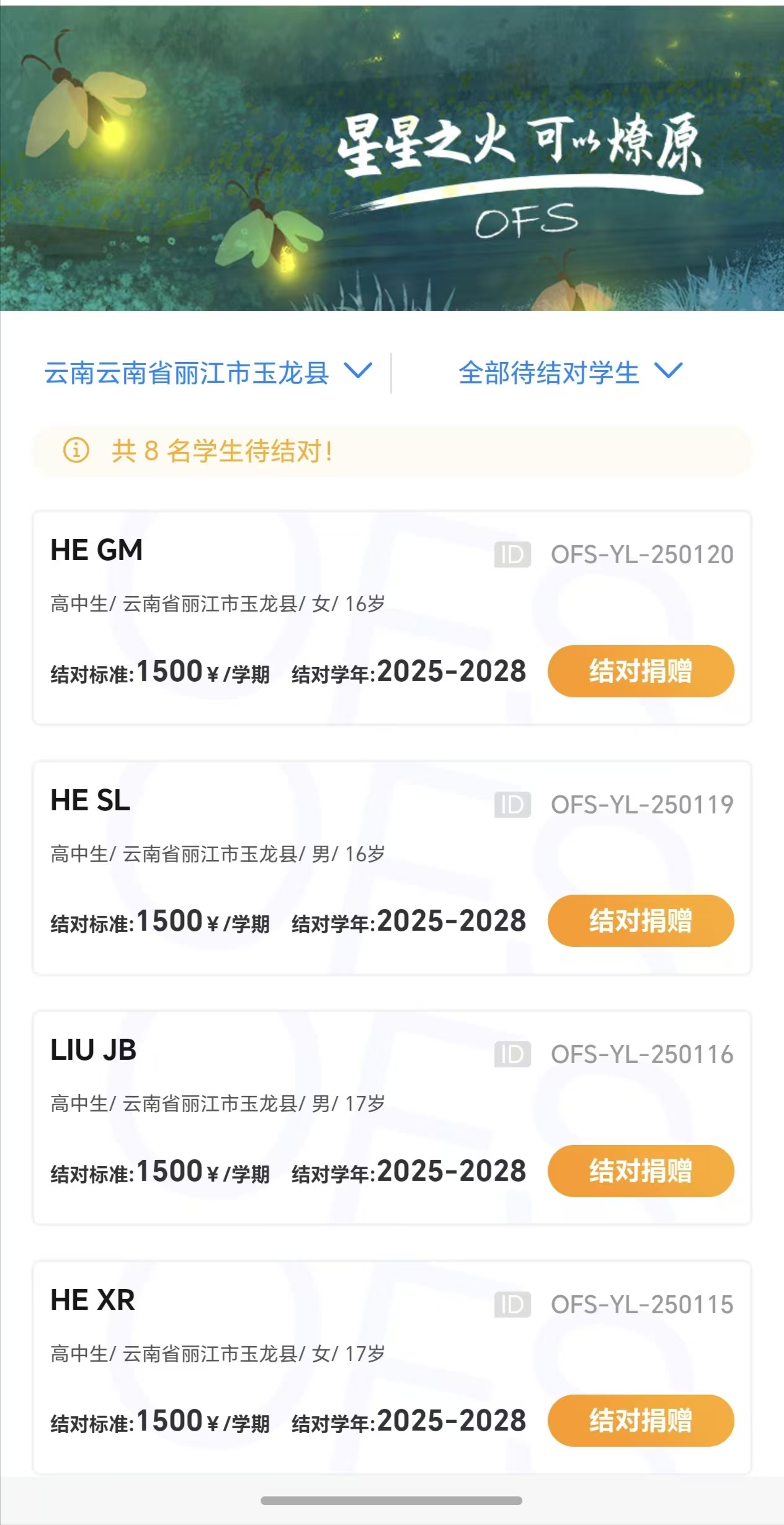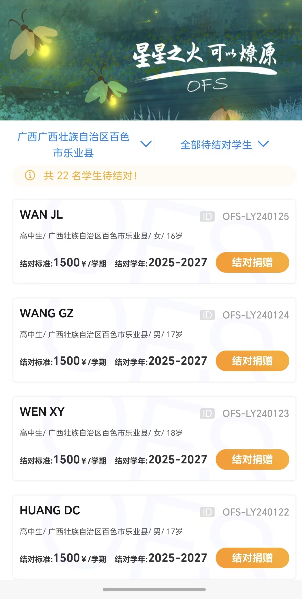 他们有初升高奖学金学生,也有在义务教育阶段需要助学金的学生。他们来自湖南通道、湖南凤凰、广西乐业、内蒙古四子王旗、云南屏边、云南禄劝、云南巧家、云南玉龙、广西乐业、甘肃通渭、河南辉县、河北平山、陕西略阳等项目点。 如果您有意向结对或宣传扩散给更多爱心人士,让这些学生能顺利完成学习,请扫描下方小程序二维码,结对学生。