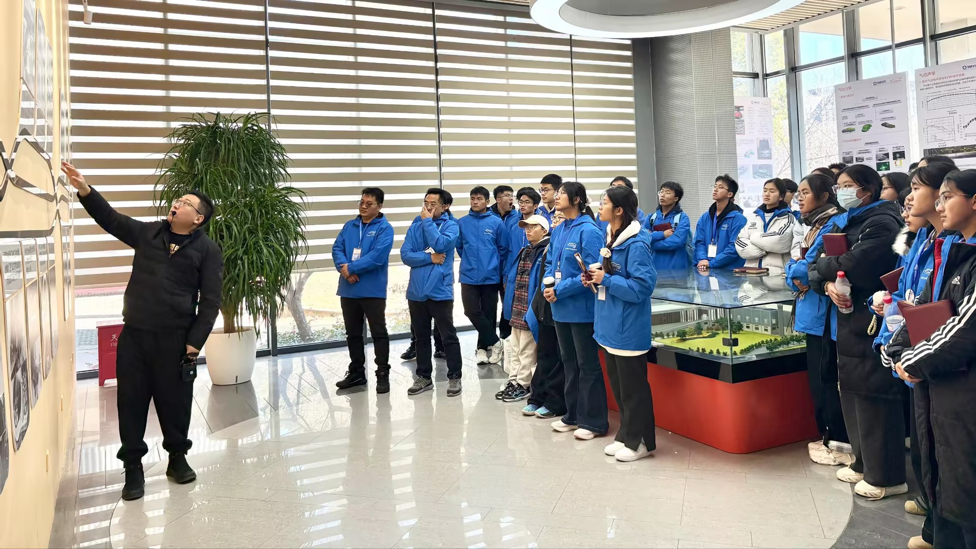 讲座意犹未尽,实践的环节已然到来。午饭后,师生们走进真实的风洞实验室。庞大的试验装置、精密的数据监测屏、低鸣的运转声——这一切让书本上的知识变得可触可感。讲解员细致解说每一处设计背后的原理,同学们围绕在设备旁,眼中写满好奇与惊叹。有人俯身观察模型,有人小声讨论气流轨迹,科学的种子,正在他们专注的目光中悄然生根。