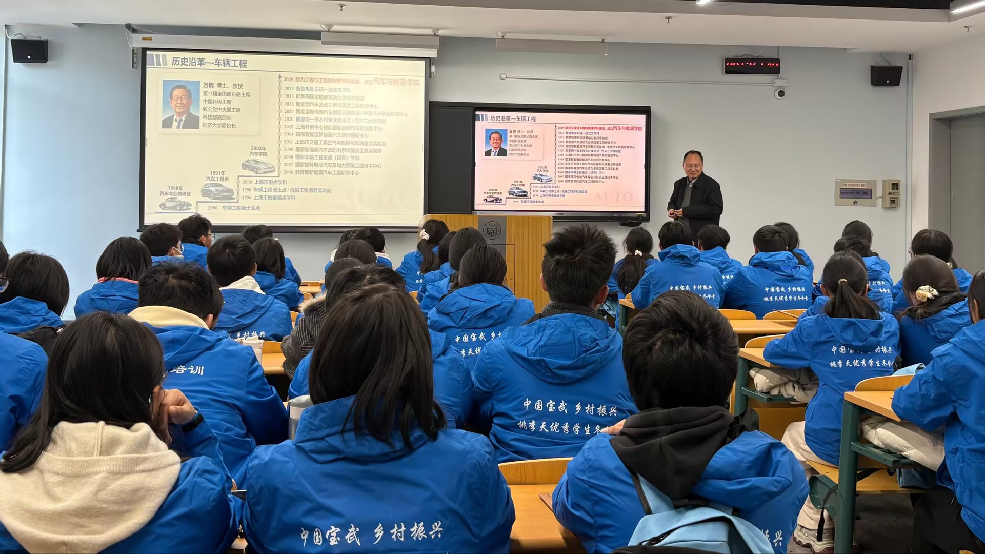 2月8日上午,50位来自云南普洱三县的师生在志愿者的带领下,一同来到了同济大学汽车学院,共同开启了这场成长之旅。墙上“同心同德同车行,济人济世济天下”的标语赫然在目,默默传递着学院的初心与担当,也让同学们对即将开始的讲座充满期待。