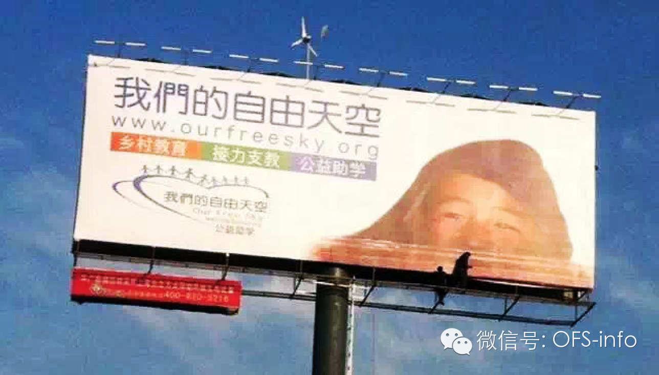 沪宁高速“我们的自由天空“广告牌今日“上架” 发表回复 沪宁高速与嘉闵高架交叉路口由上海志愿者赞助的OFS广告牌 在此特别感谢上海“摇摇晃晃”姚彬姚总!(右一) 关于我们:我们的自由天空(OFS),民间乡村教育公益组织