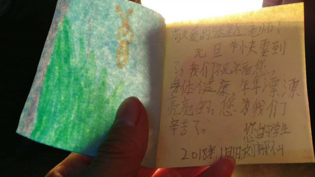 万圣节,孩子们自己动手制作出有趣而独特的面具,我们一起制作杰克灯,了解节日的来历;我生病回重庆了,孩子们在教室里哭成一片(这是本校老师告诉我后才知道的);圣诞节,我们一起布置圣诞树,扮演圣诞老人和小鹿鲁道夫,我们一起做火锅,大快朵颐;元旦节,我们做灯笼,画梅花,做龙灯,剪雪花装点我们的教室。为了庆祝每一个节日,我跑遍县城买来材料和工具,连夜为孩子们做头饰,布置教室环境。尽心尽力准备奖品和礼物,为的只是看到孩子们天真的笑脸。我们一起经历了这么多值得回忆的快乐时光,当要转身离开的时刻,这些感动再次在心里此起彼伏。