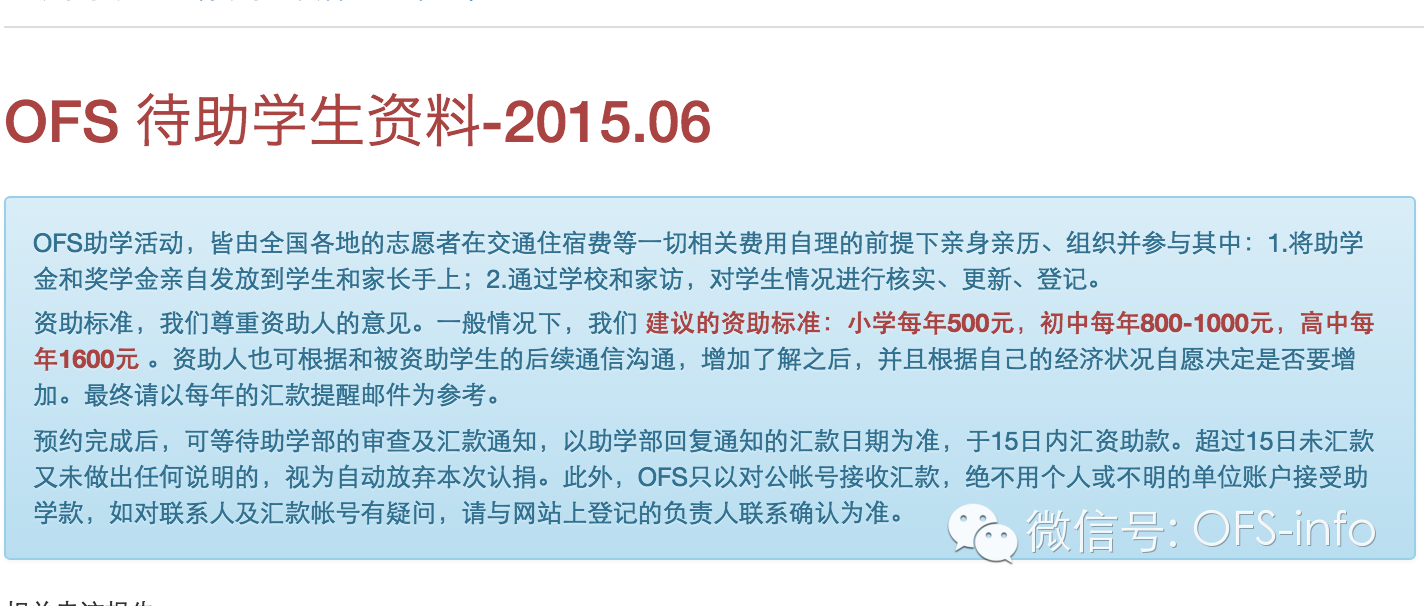 预约完成后,可等待助学部的审查及汇款通知,以助学部回复通知的汇款日期为准,于15日内汇资助款。超过15日未汇款又未做出任何说明的,视为自动放弃本次认捐。此外,OFS只以对公帐号接收汇款,绝不用个人或不明的单位账户接受助学款,如对联系人及汇款帐号有疑问,请与网站上登记的负责人联系确认为准。