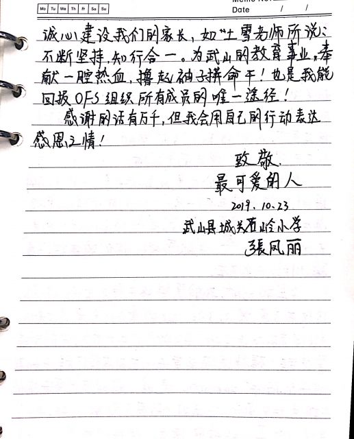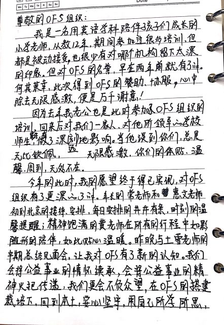 因为去年我老公也是此时参加了OFS组织的培训,回来后对我们一家人,对他所领导的学校师生宣传,有了深远地影响。当他谈及你们,总是无比钦佩,无限感激,你们的体贴,温馨,周到,无处不在。