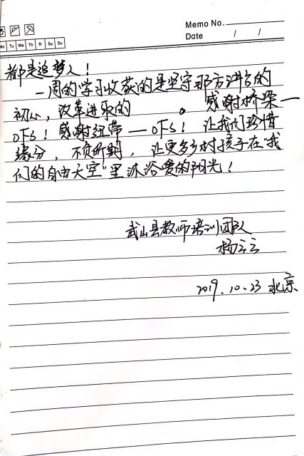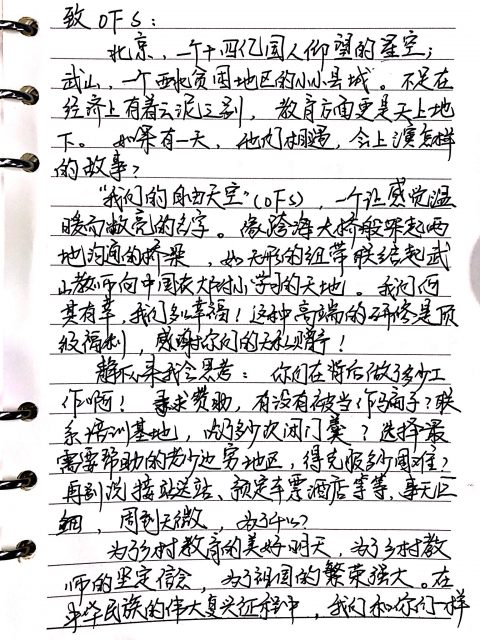 北京,一个十四亿国人仰望的星空;武山你,一个西北贫困地区的小小县城。不仅在经济上有着云泥之别,教育方面更是天上地下。如果有一天,他们相遇,会上演怎样的故事?· “我们的自由天空“,一个让我感受温暖而敞亮的名字。像跨海大桥般架起两地沟通的桥梁,如无形的纽带联结武山教师向中国农业大学附属小学学习的天地。我们何其有幸,我们多么幸福!这种高端的研修是顶级福利,感谢你们的无私赠予! 静下心来令我思考:你们在背后做了多少工作啊!寻求赞助,有没有被当作骗子?联系培训基地,吃了多少闭门羹?选择最需要帮助的老少边穷地区,得克服多少困难?再别说接站送站,预定车票酒店等等,事无巨细,周到无微,为了什么? 为了乡村教育的美好明天,为了乡村教师的坚定信念,为了祖国的繁荣强大。在中华民族的伟大复兴征程中,我们和你们一样都是追梦人! 一周的学习收获的是坚守那方讲台的初心,改革进取的。感谢桥梁-OFS!让我们珍惜缘分,不负期望,让更多乡村孩子在“我们的自由天空 ”里沐浴爱的阳光!