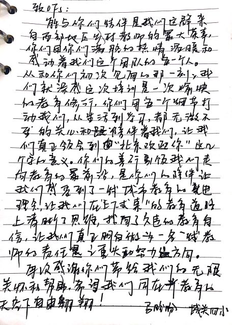能与你们结伴是我们这群来自西部地区乡村教师的最大荣幸,你们用你们满腔的热情温暖和感动着我们这个团队的每一个人。从和你们初次见面的那一刻,我们就深感这次培训是一次愉快的教育修行,你们用每一个细节打动我们,从生活到学习,都无微不至的关心和陪伴着我们,让我们真正领会到“北京欢迎你”这几个字的意义。你们的善行引领我们走向教育的最前沿,是你们的陪伴让我们感受到了一线城市教育的先进理念,让我们再在“上下求索“的教育道路上清晰了思维,找回了久违的教育自信,让我们真正明白作为一线教师的责任之重大和努力方向。